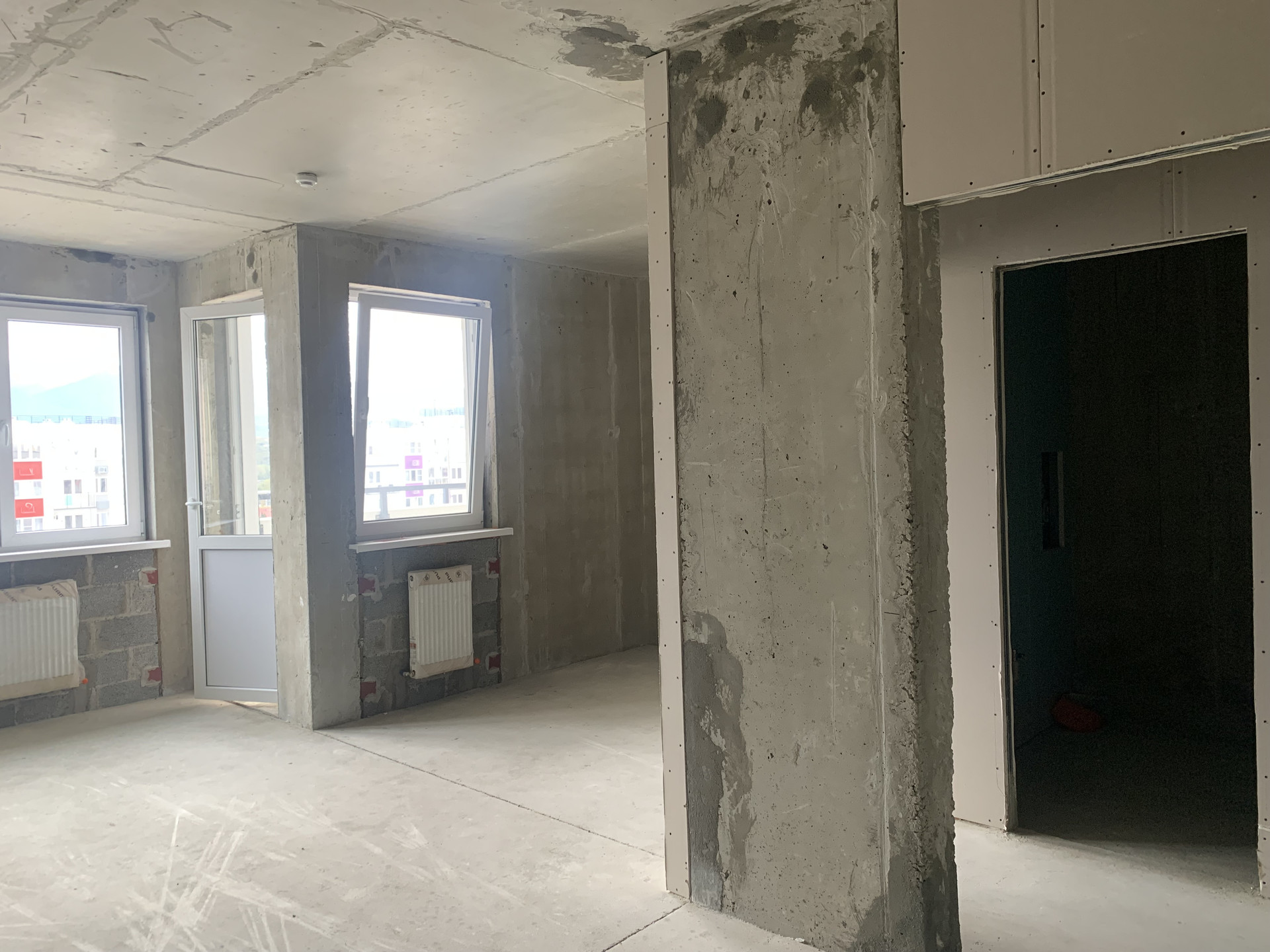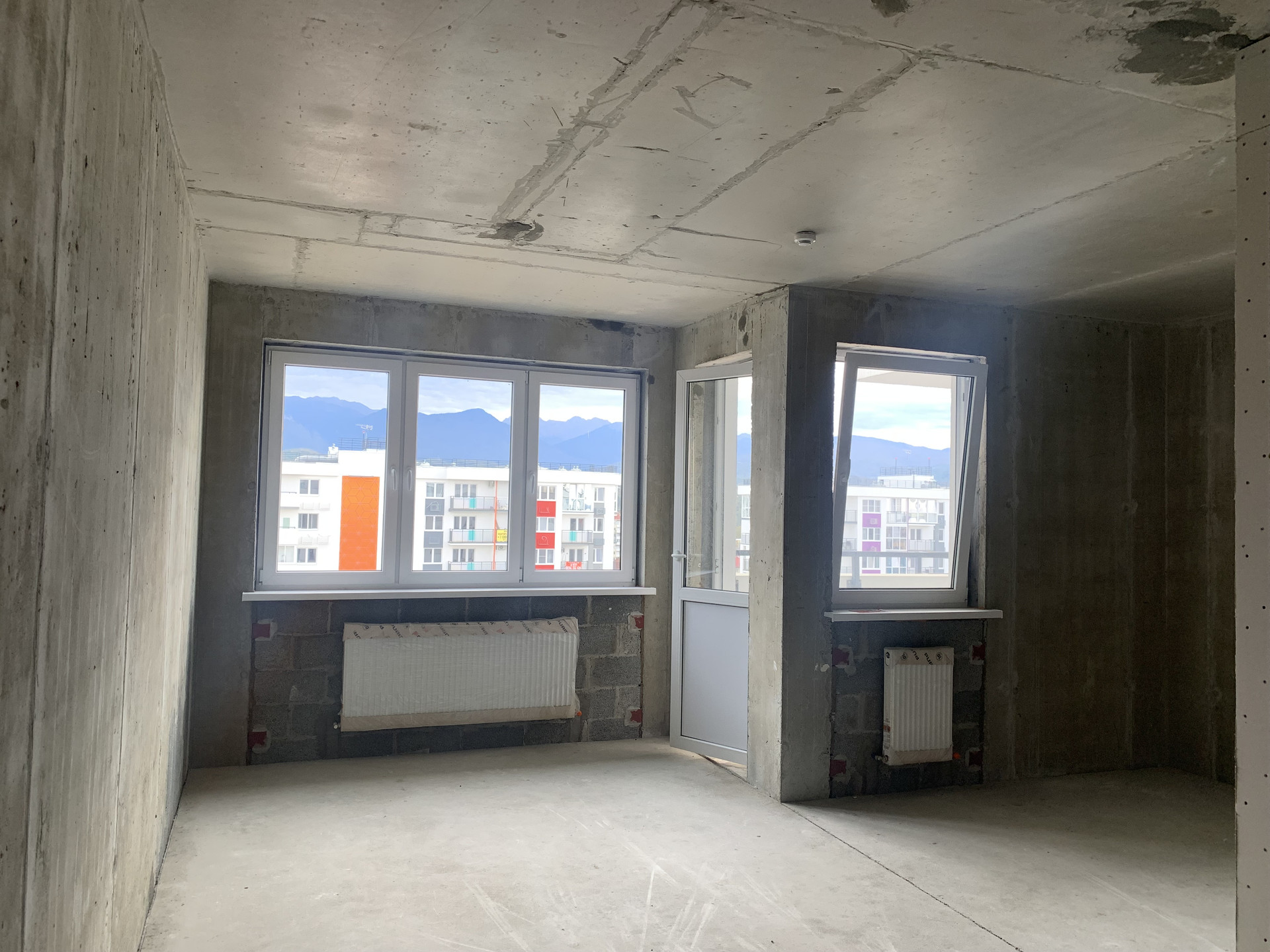 Квартира площадью 31.8м2 + 2.9м балкон, легко планируется в изолированную спальню и просторную кухню-гостиную. Вид на горы и детскую площадку.