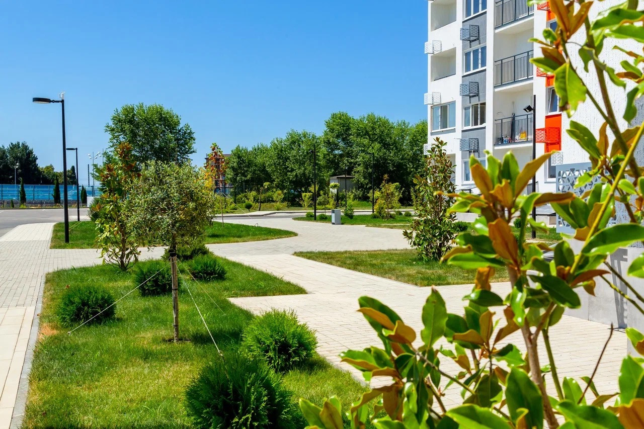 -ландшафтное озеленение, высажены фруктовые деревья, вы можете гулять по ЖК и наслаждаться зеленью