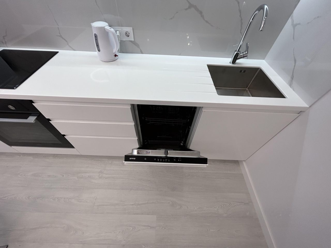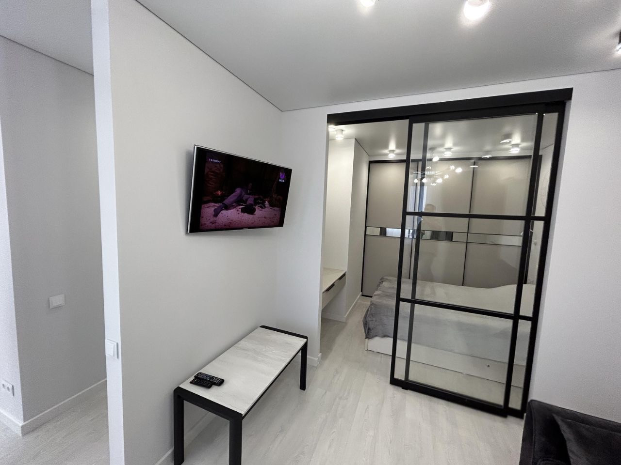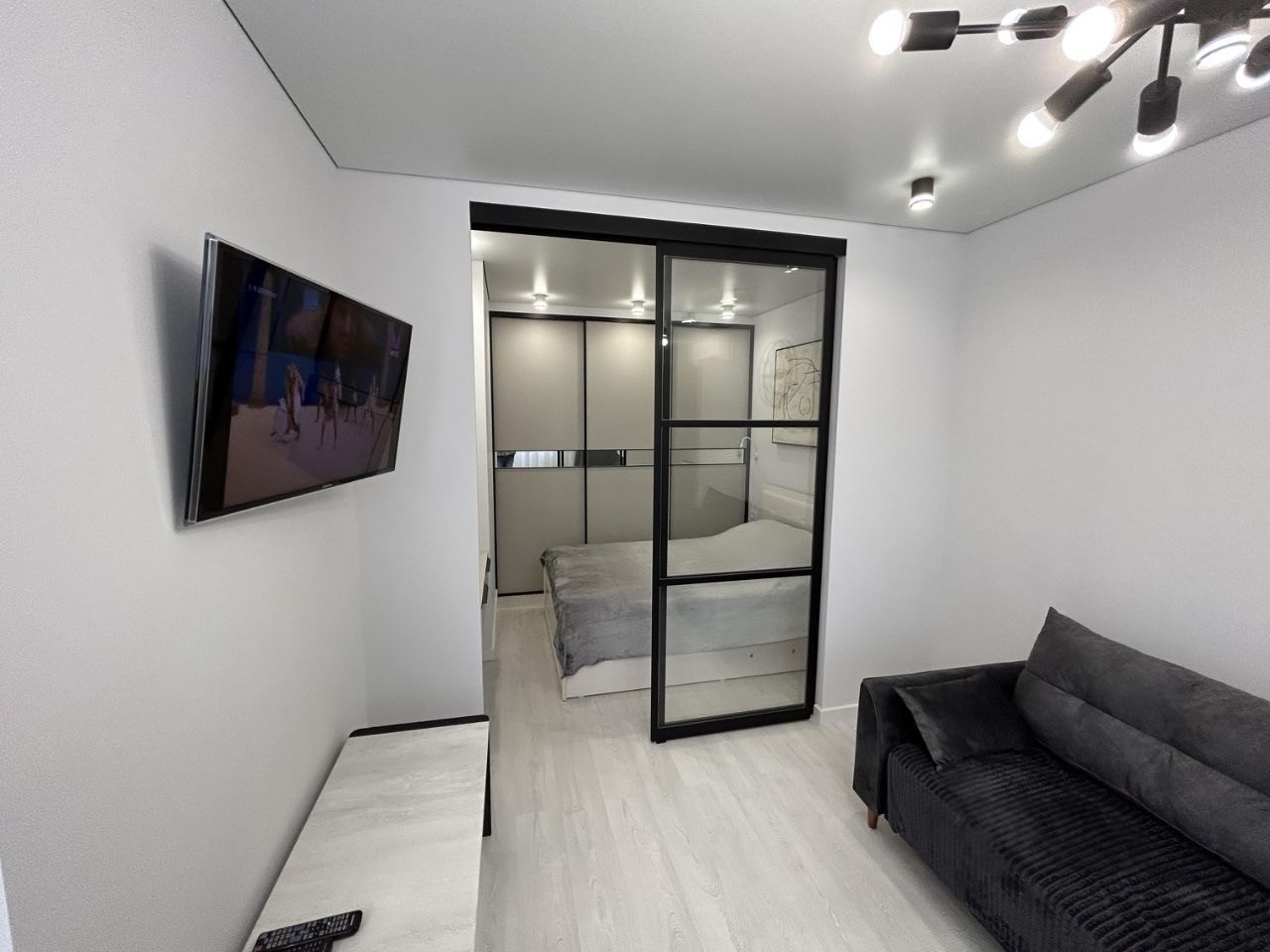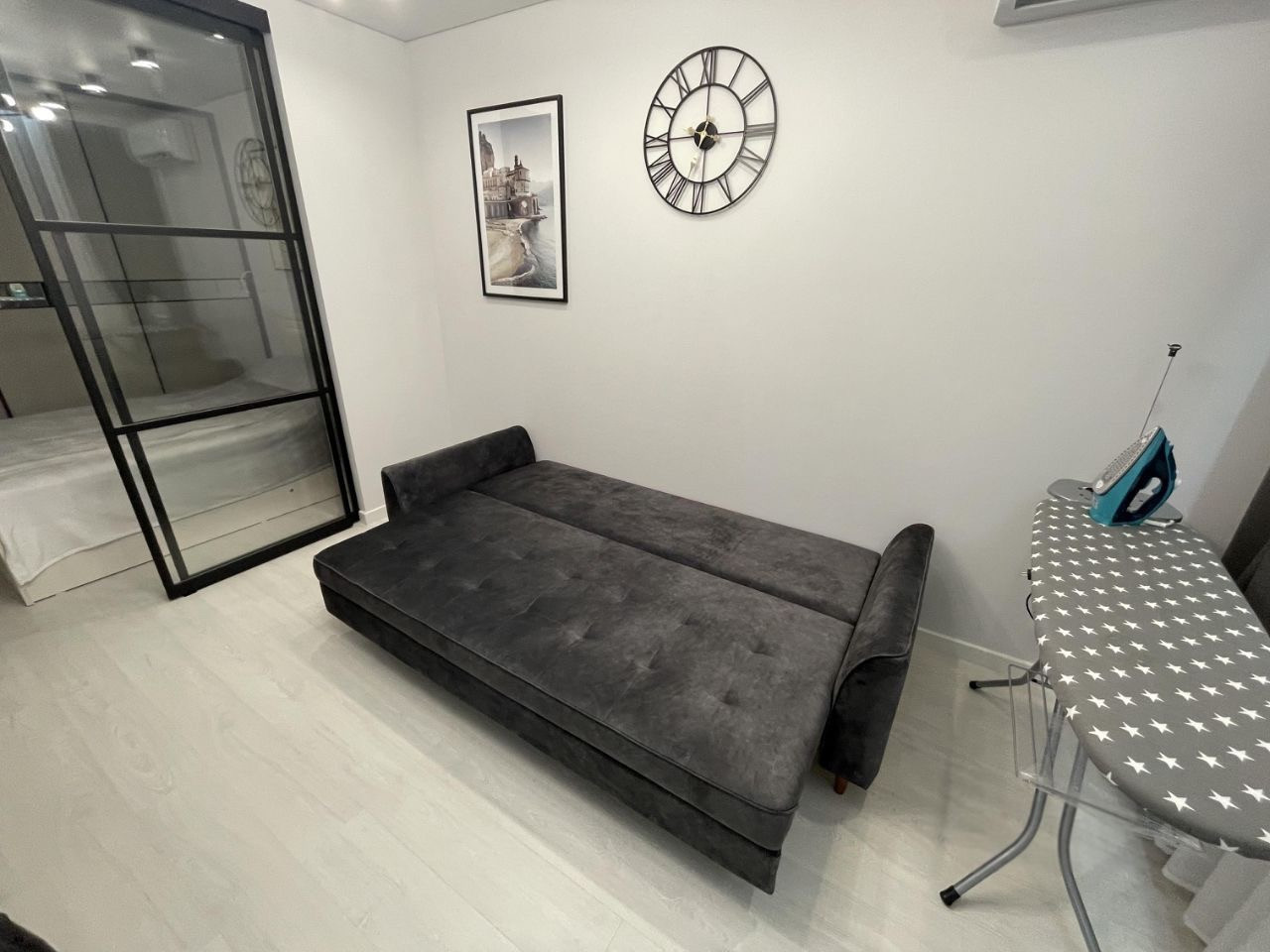 Пол выложен кварцвинилом, в прихожей два больших шкафа для хранения, три спальных места- диван двухместный и детская кровать.