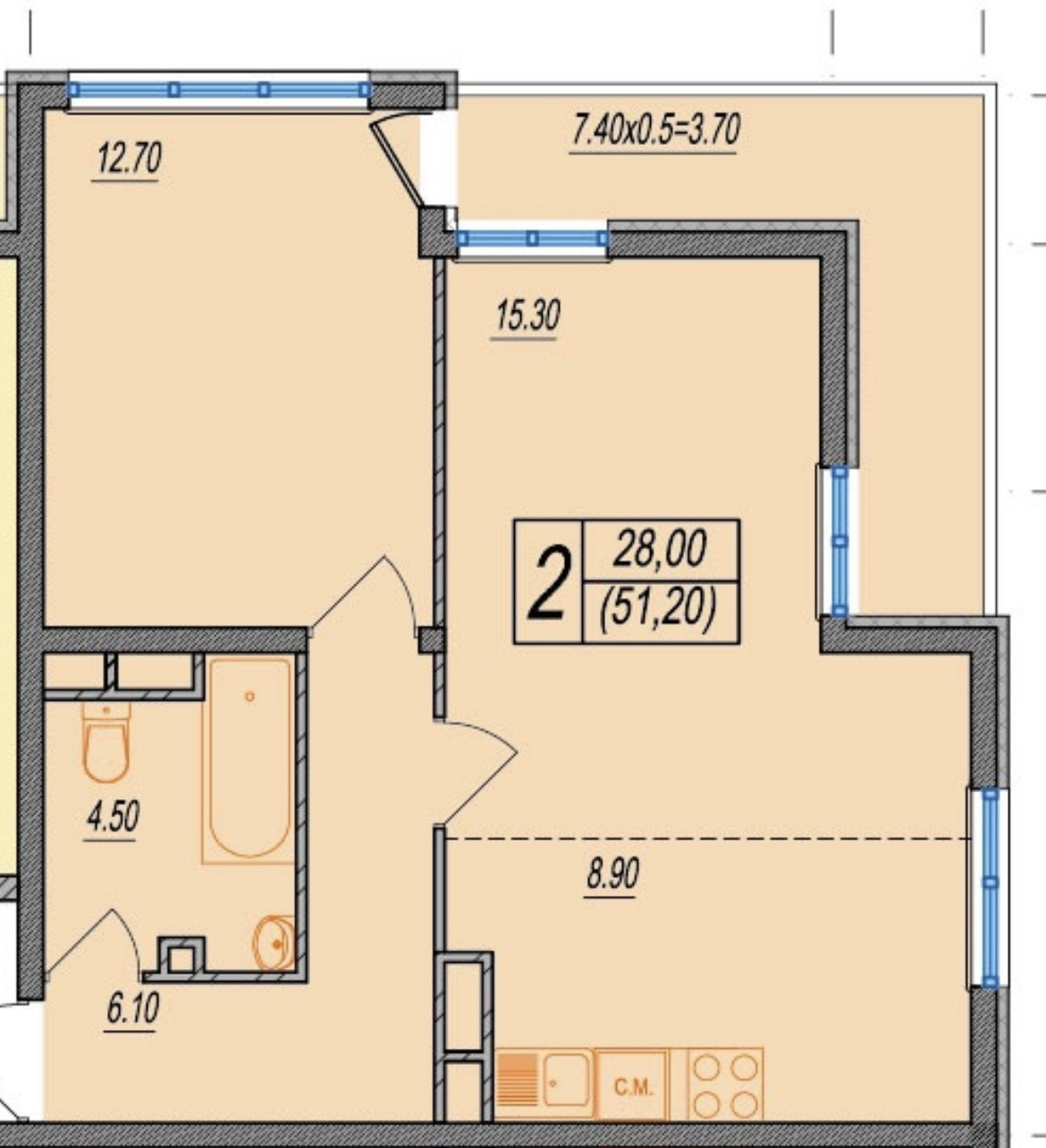 Общая площадь 51.2 м2