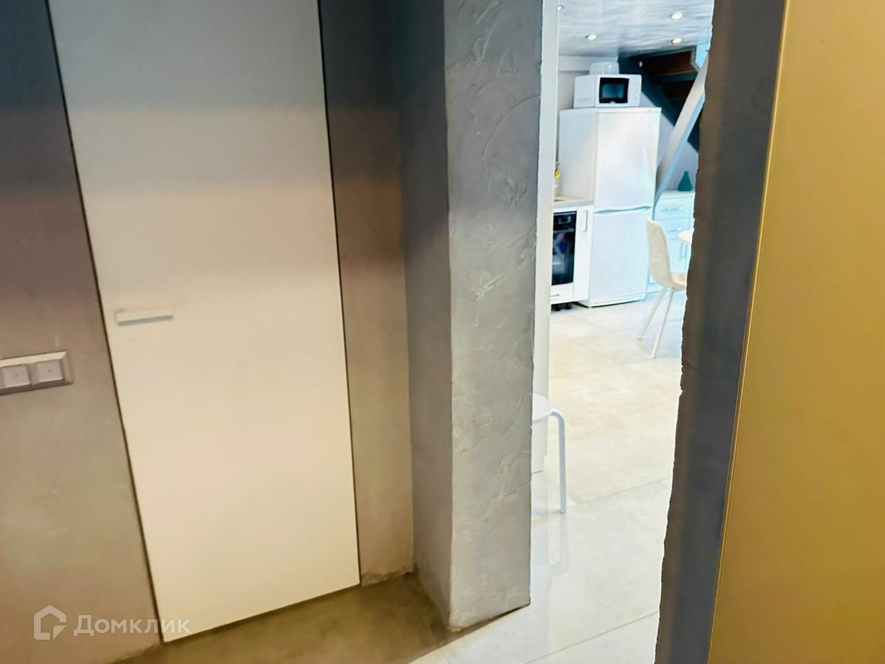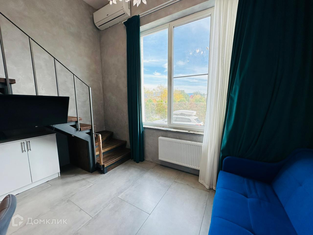 Высота потолков составляет около 3,9 метра. На первом этаже расположены кухня-гостиная, санузел с душем и туалетом, а на втором уровне — спальня и санузел.