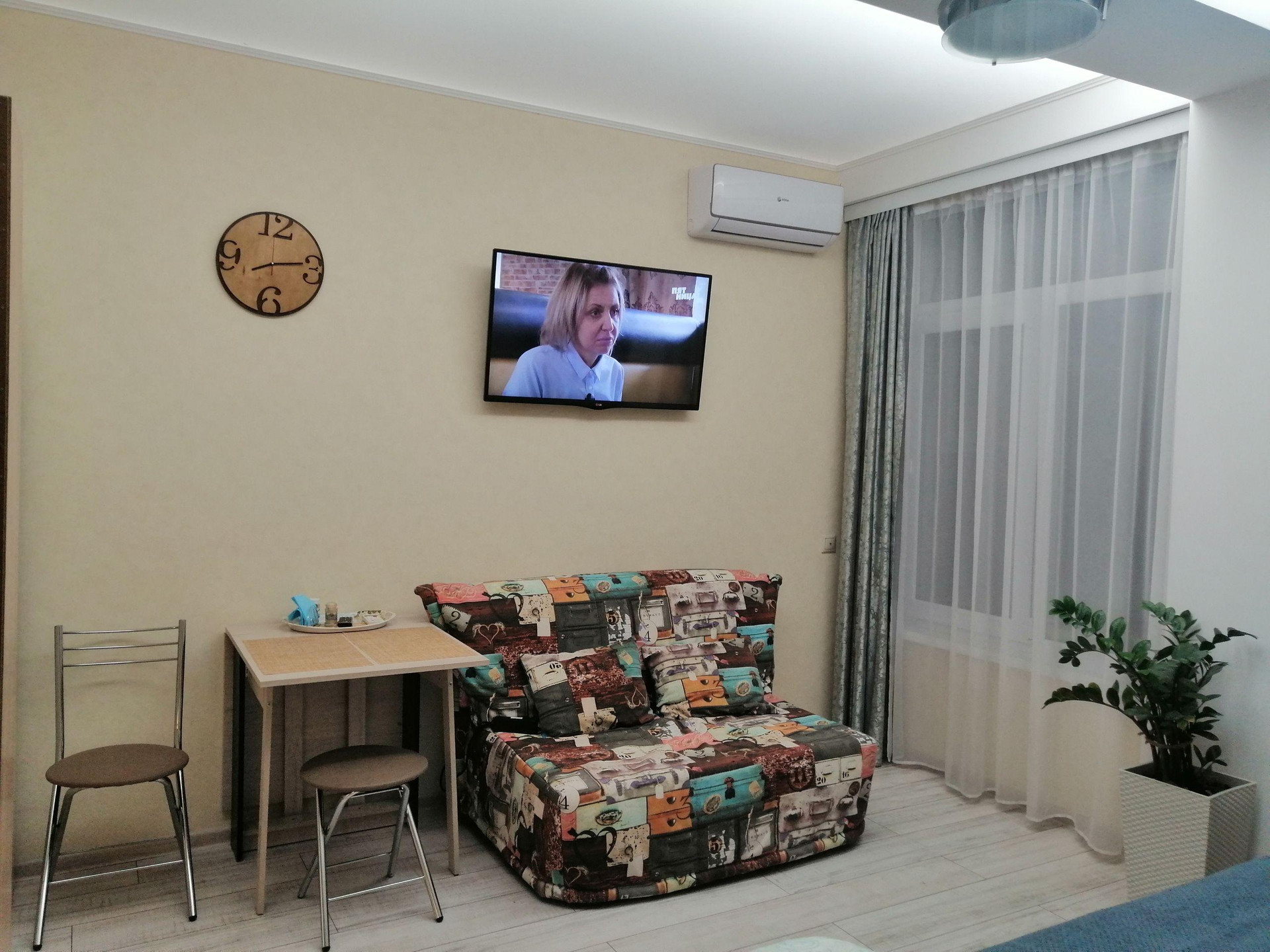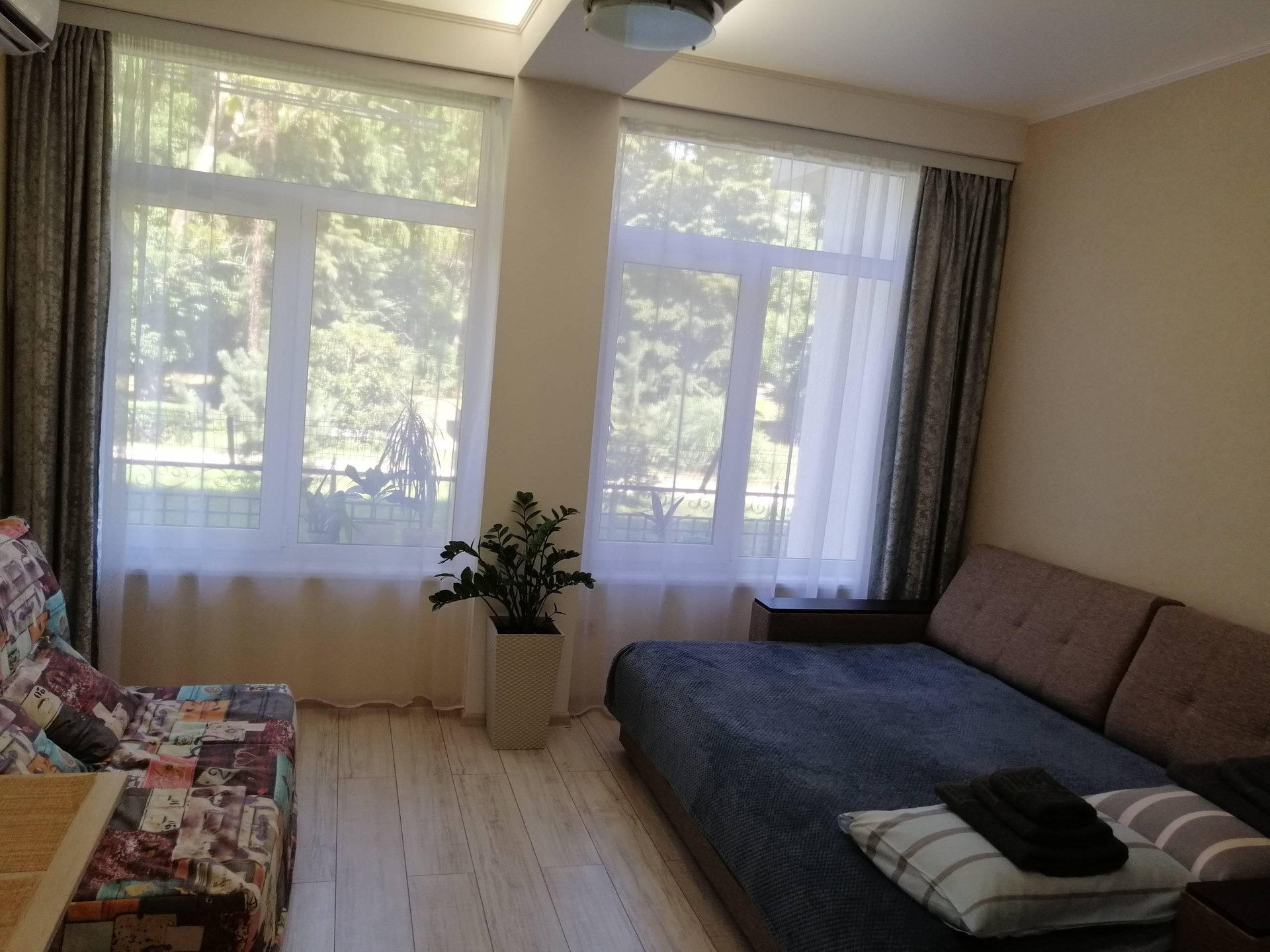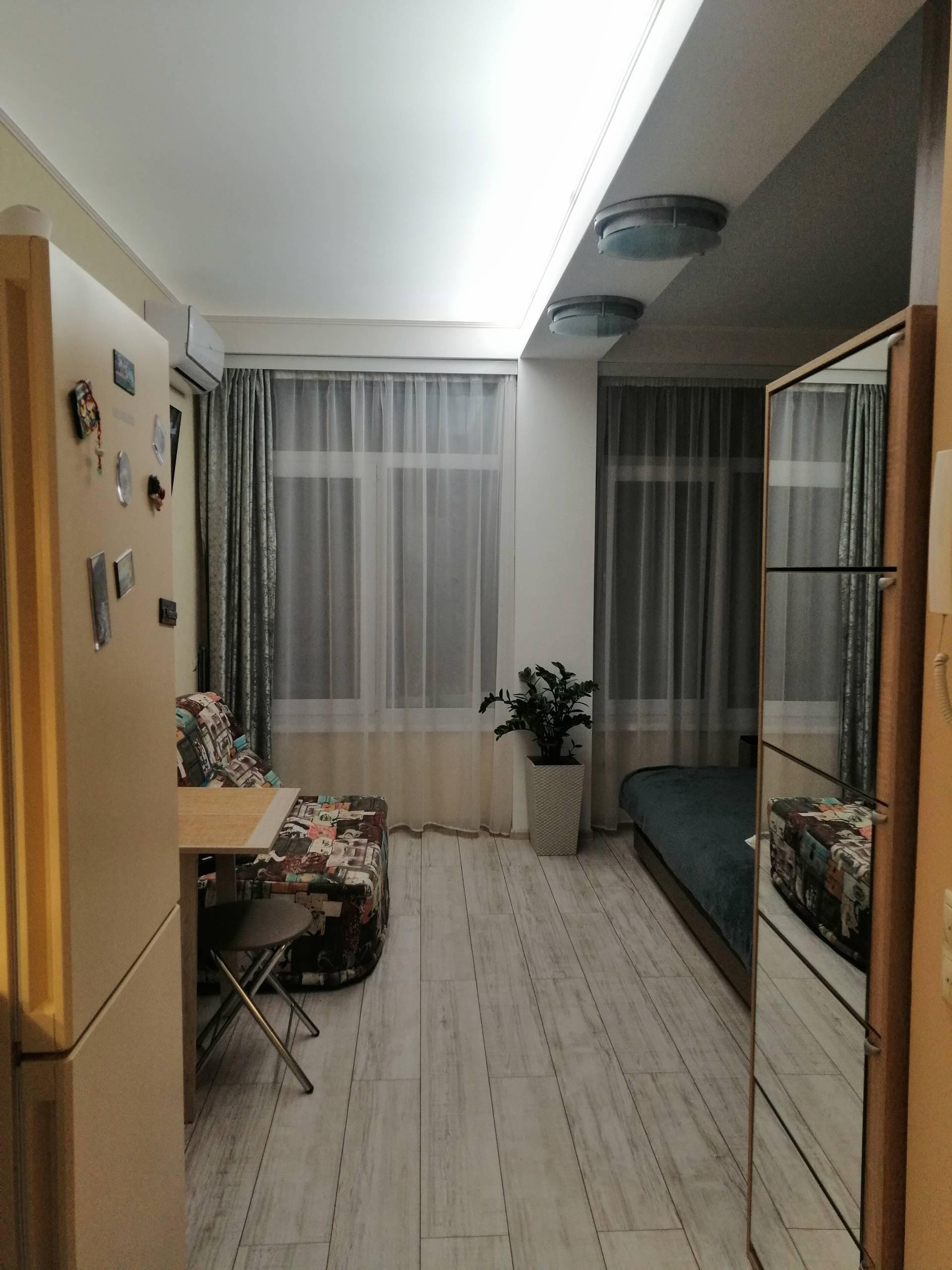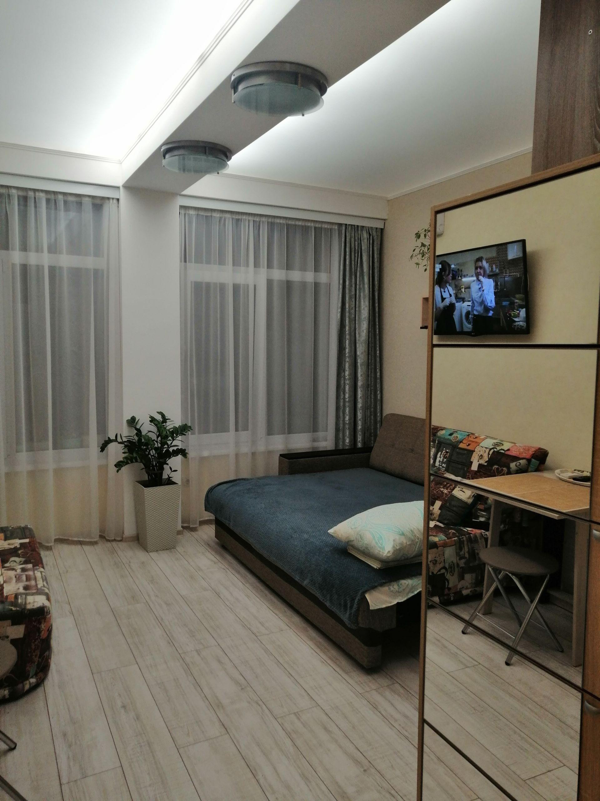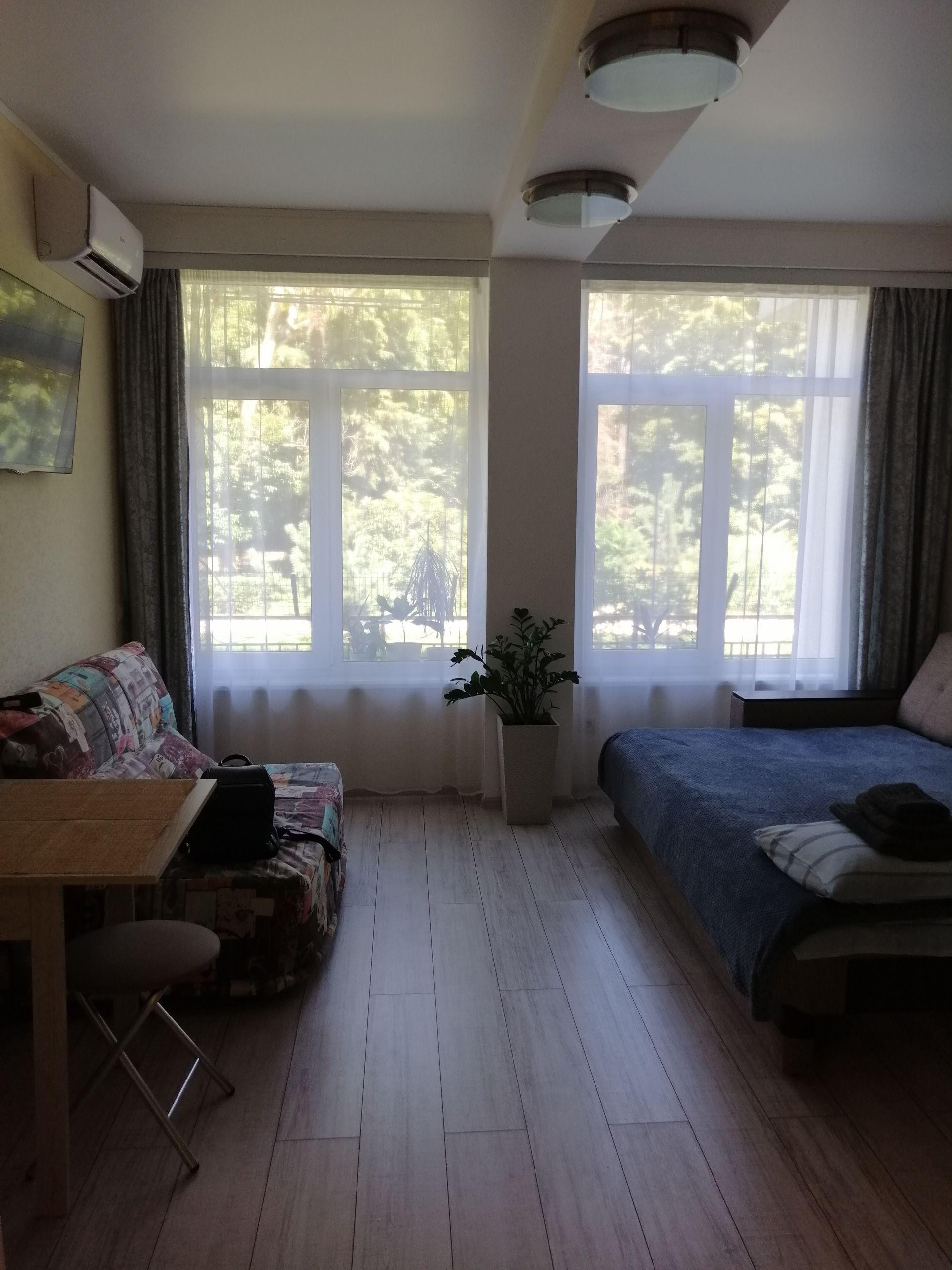 Уютная небольшая студия с видом на дендрологический парк "Южные культуры".Есть все необходимое для комфортного проживания 1-2 человек.Сдается с октября по июнь.Коммунальные платежи в осенне-зимний период  2-3 т.Летом с июля по октябрь 5т