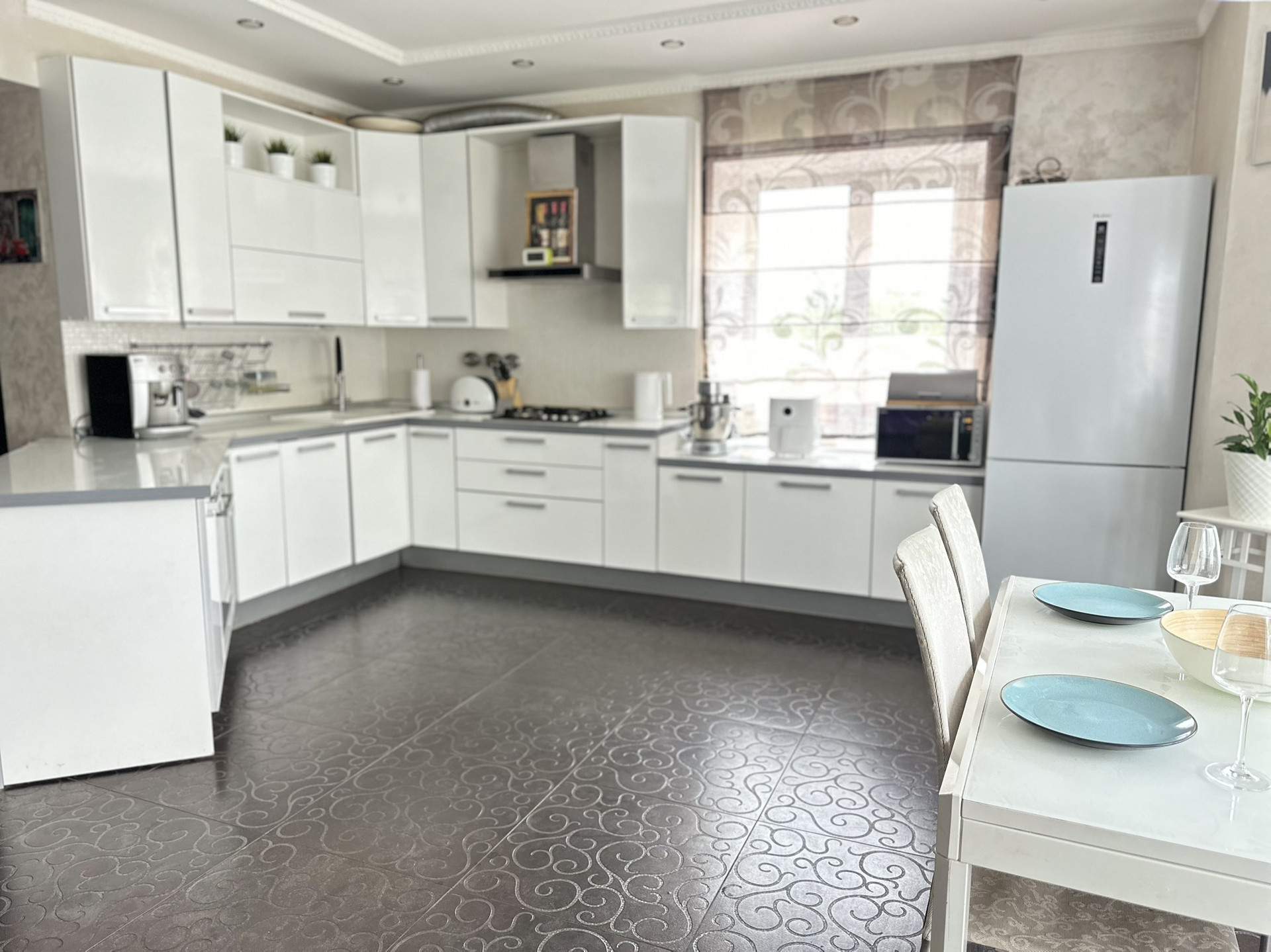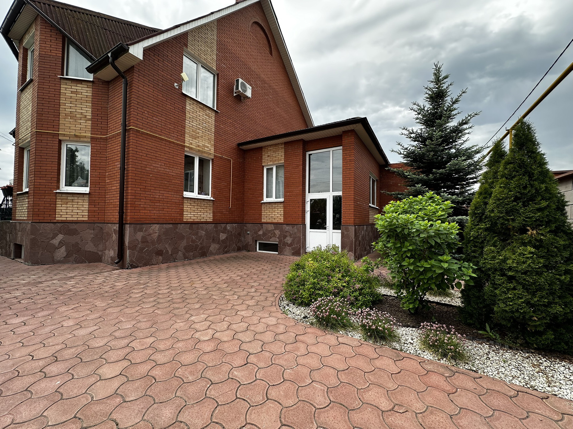 Гараж на 2 машины, с выходом в дом. Первый этаж кухня-гостиная, и гостевая комната.  На втором этаже три спальни и зимний сад с верандой. На территории открытая  площадка для машин, беседка с водой, канализацией и санузлом, подогреваемый бассейн, детская площадка с игровым домиком,  теплица. Территория с ландшафтным дизайном, плодовыми насаждениями.