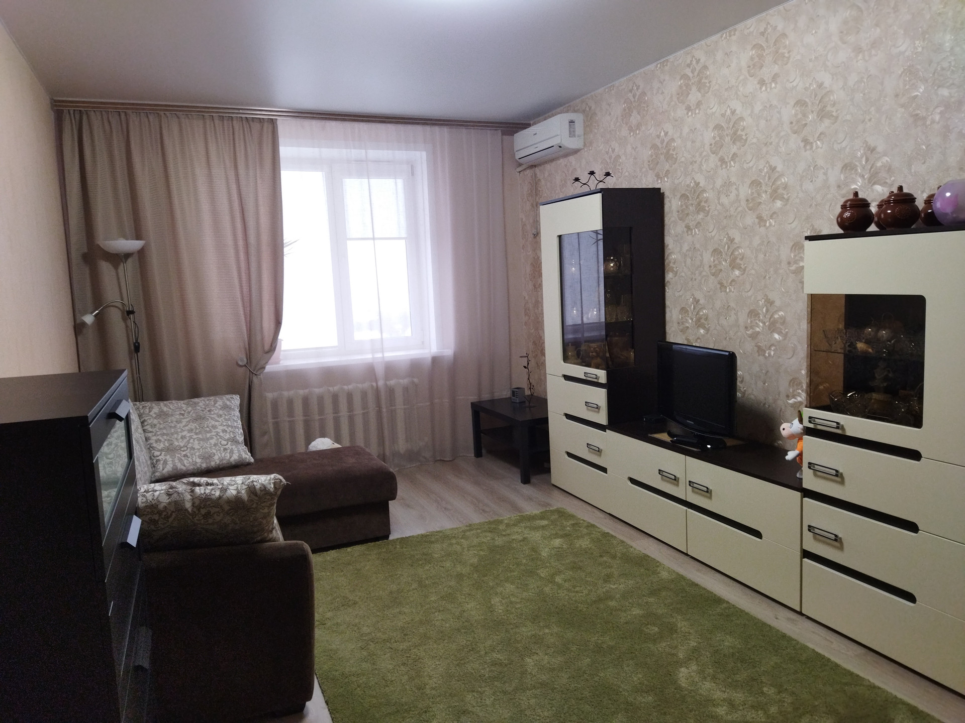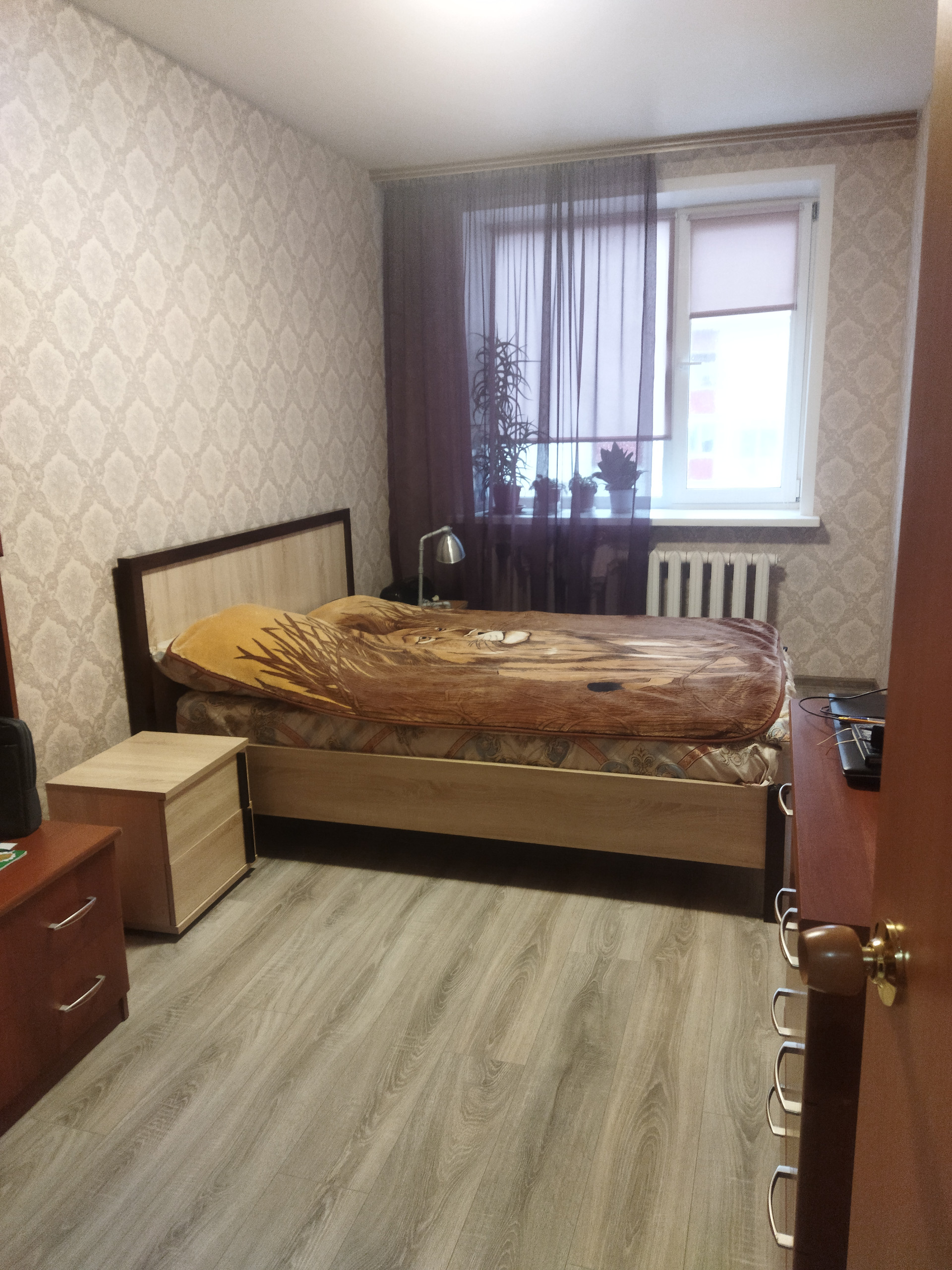 Функциональная планировка квартиры с окнами на две стороны (гостиная на улицу - солнечную сторону, остальные окна во двор, на лес) обеспечивает комфортный микроклимат и летом и зимой. Отопление индивидуальное, обеспечивается двухконтурным газовым котлом, что позволяет экономить на оплате, устанавливать любую температуру в квартире, когда это нужно, и не зависеть от отключений горячей воды. В гостиной установлен кондиционер. В коридоре вместительная гардеробная и большой встроенный шкаф. Выход на лоджию из кухни, лоджия остеклена и отделана вагонкой, также есть встроенный шкаф. Установлена качественная входная дверь, натяжные потолки во всей квартире, кроме санузлов, в коридоре - с точечной подсветкой. Выровнены стены и пол, в комнатах ламинат, на кухне и в коридоре линолеум. Стены в ванной комнате - пластиковые панели, в санузле - крашеные. Из мебели оставляем новый кухонный гарнитур и новый большой шкаф-купе в спальне, остальное по договорённости.