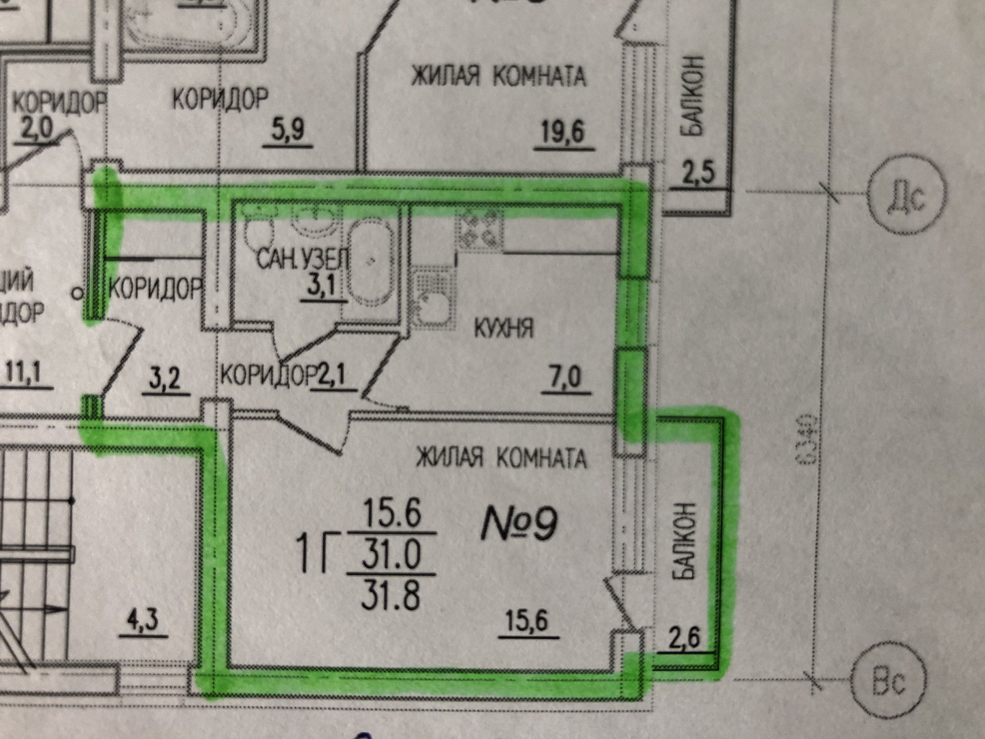 Жилая площадь 15.6 м2