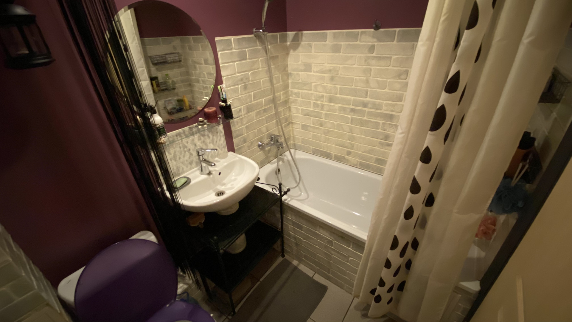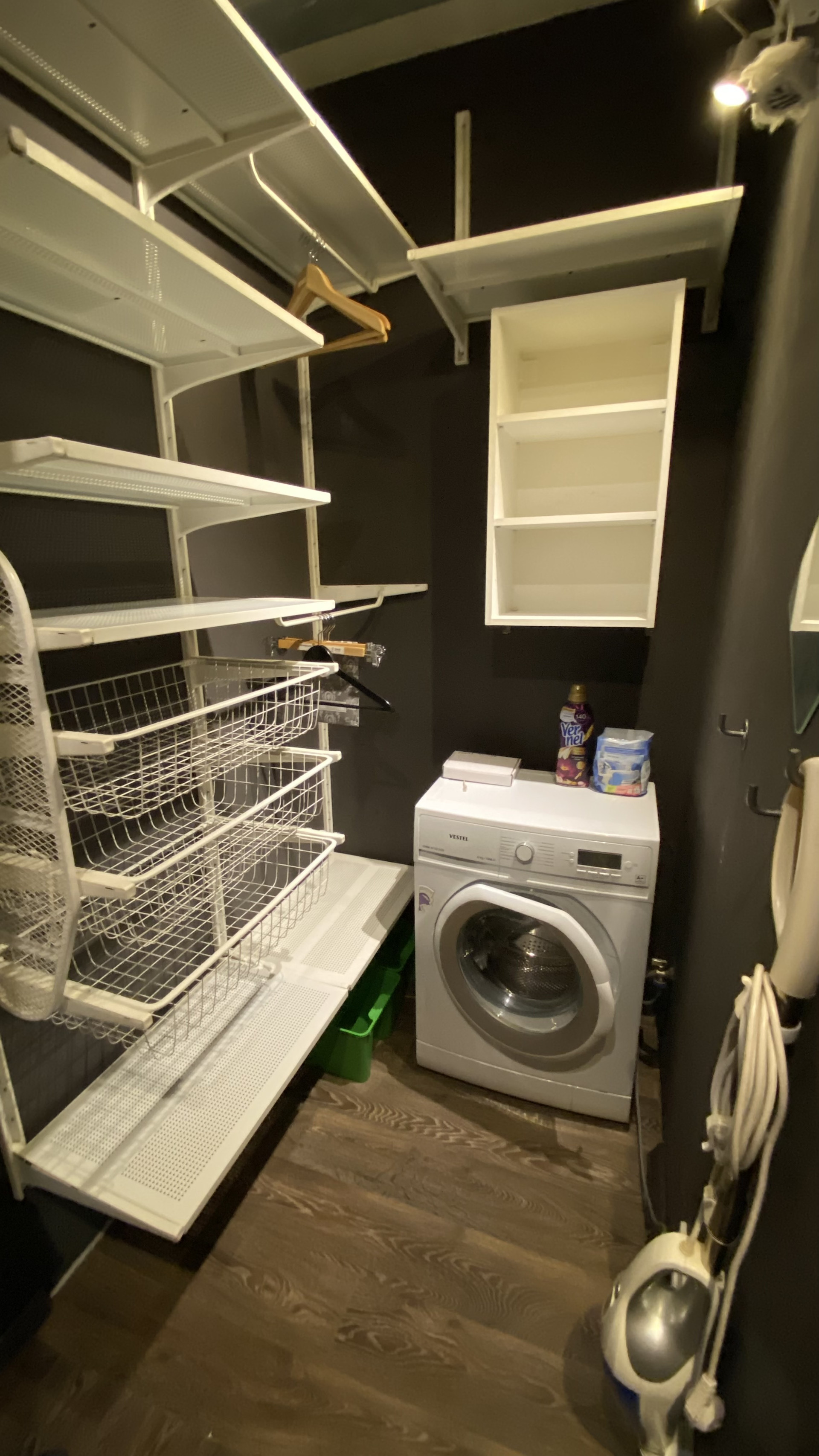 Есть полноразмерная ванна, стиральная машина, сушилка для белья и подргрев стены.