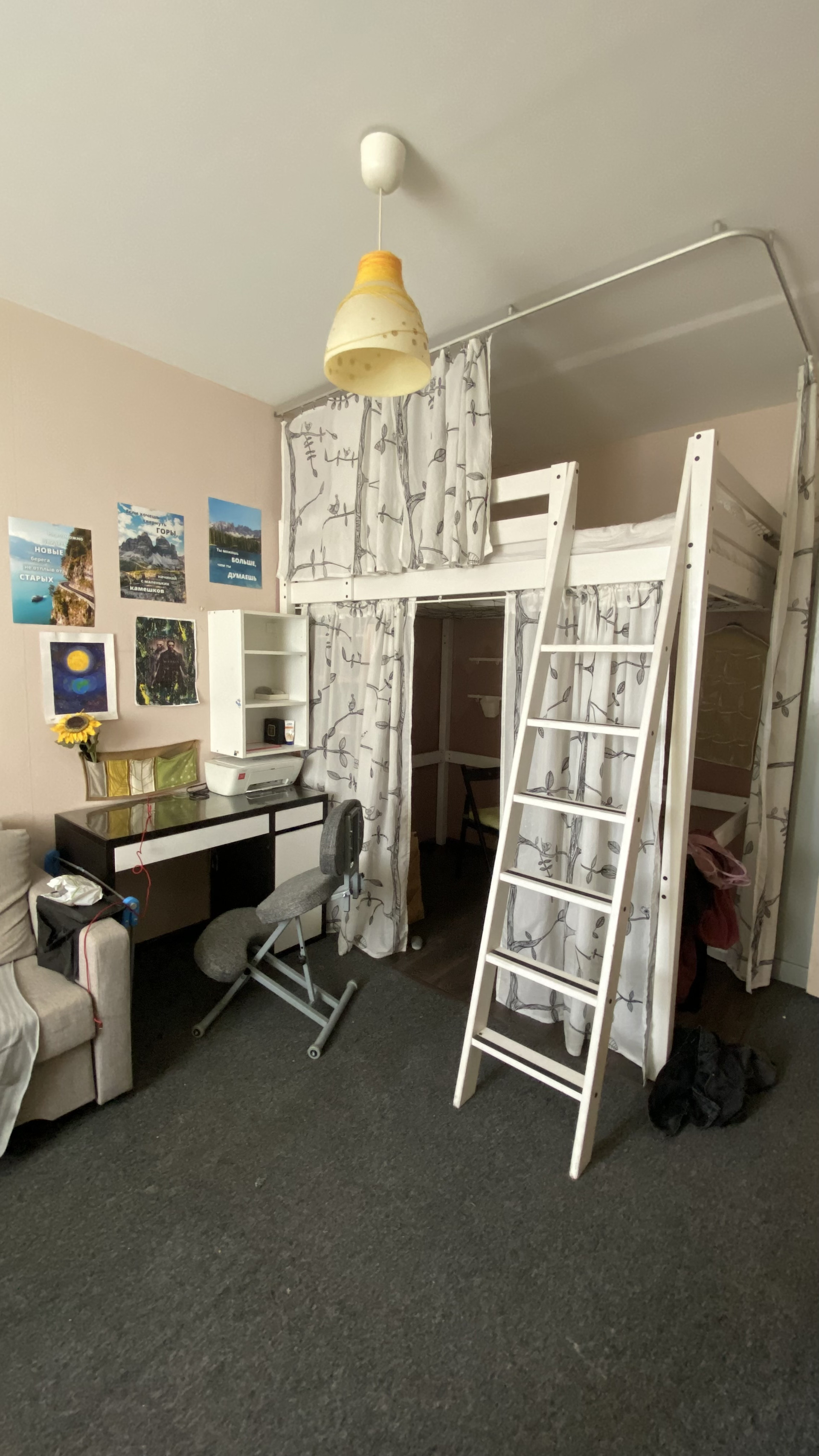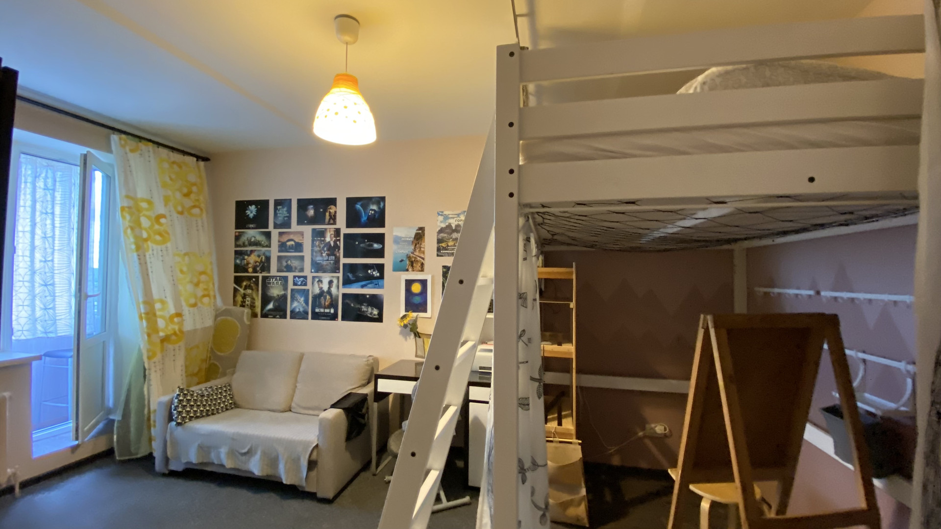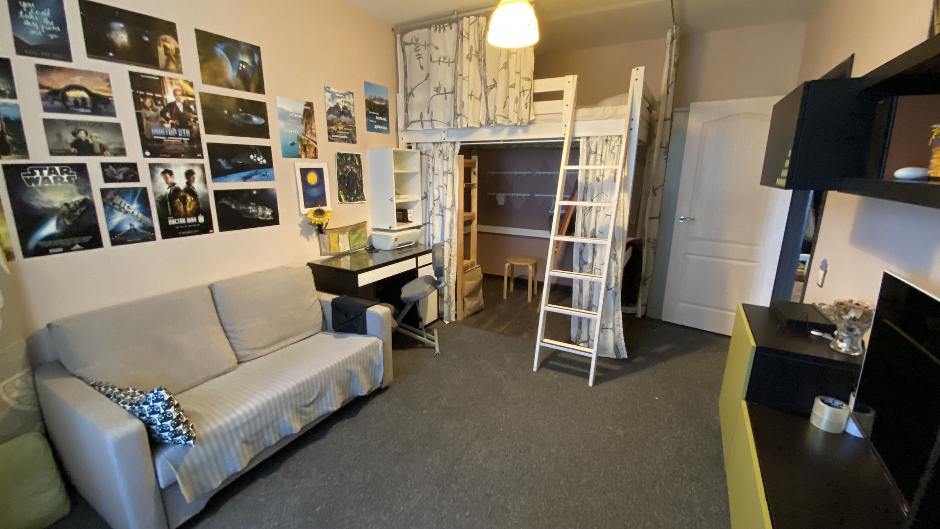 Остается ВСЯ мебель и техника. В комнате письменный стол, раскладной диван, шкафчики. Двуспальная кровать-чердак с дорогим ортопедическим матрасом. Спальная зона отгорожена занавеской. Под кроватью можно сделать рабочее место, мастерскую или просто место для отдыха. Вся мебель из икеи!