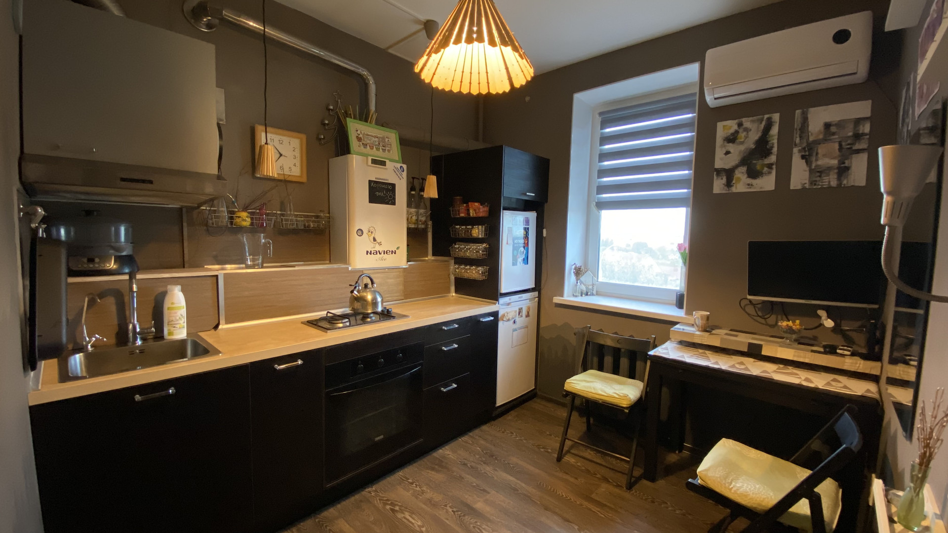 Встроенная кухня из икеи, холодильник, морозильник, все остается. Хорошая духовка zanussi, много розеток, фильтр для воды встроен в раковину. На кухне есть раздвижной стол. На стене монитор, к нему подключен мини-компьютер, можно смотреть фильмы. Проведен интернет - аист, остаётся роутер.