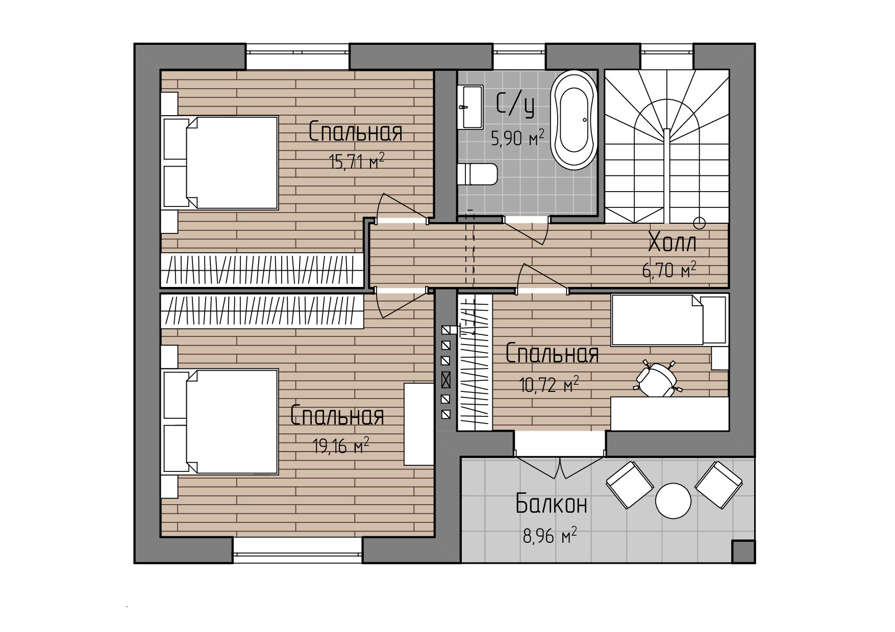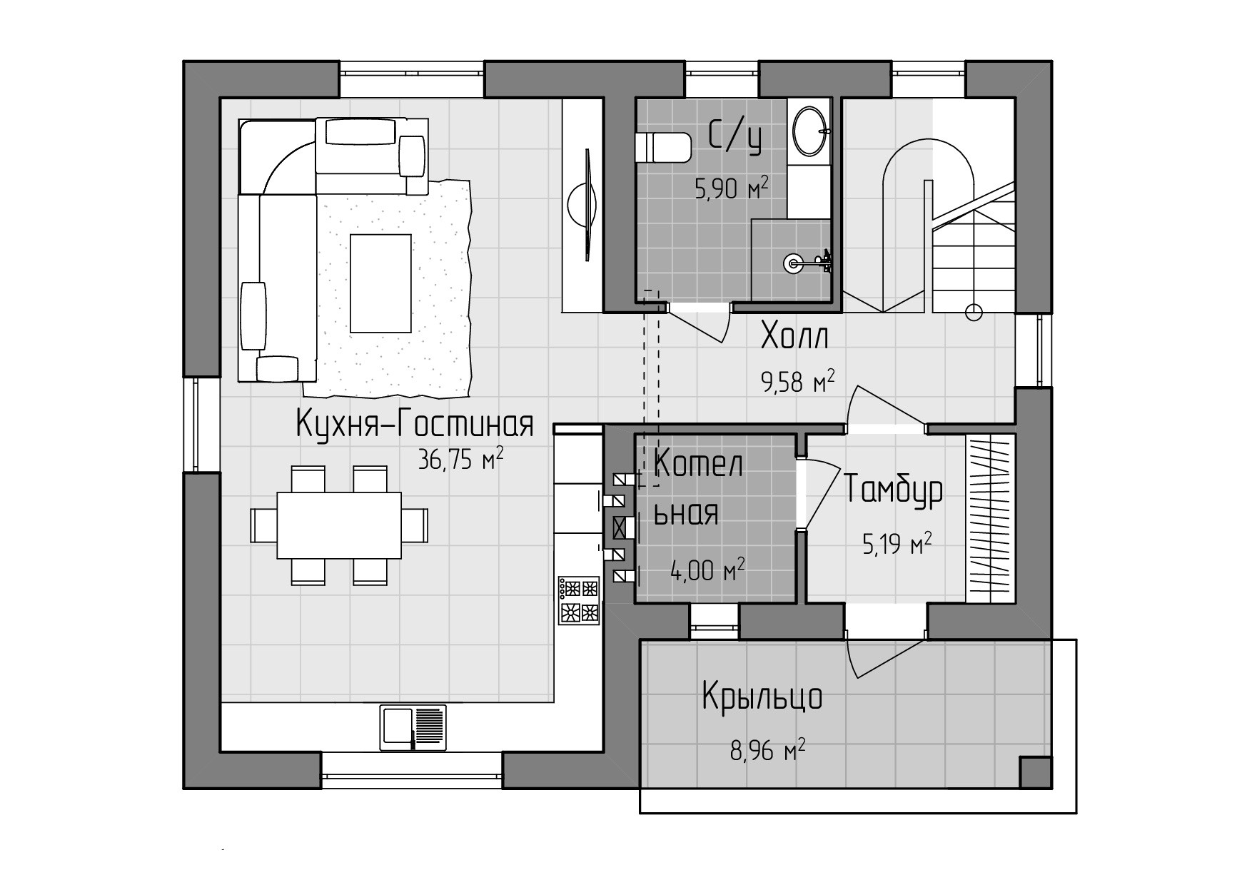 Дом по достоинству оценят те, кто ценит грамотное зонирование домашнего пространства. Классический вариант использования такой планировки предполагает использование первого этажа в качестве общего пространства. Просторная кухня-гостиная площадью почти 37 кв. м обязательно станет любимым местом для встреч с семьей и гостями дома. А второй этаж логично использовать в качестве приватного пространства для всех членов семьи. Для отдыха и комфортной жизни здесь оборудованы три спальни, одна из которых имеет собственный выход на балкон. Коттедж доступен в черновой отделке, а значит, вы сможете зонировать и обустроить это пространство по своему вкусу.