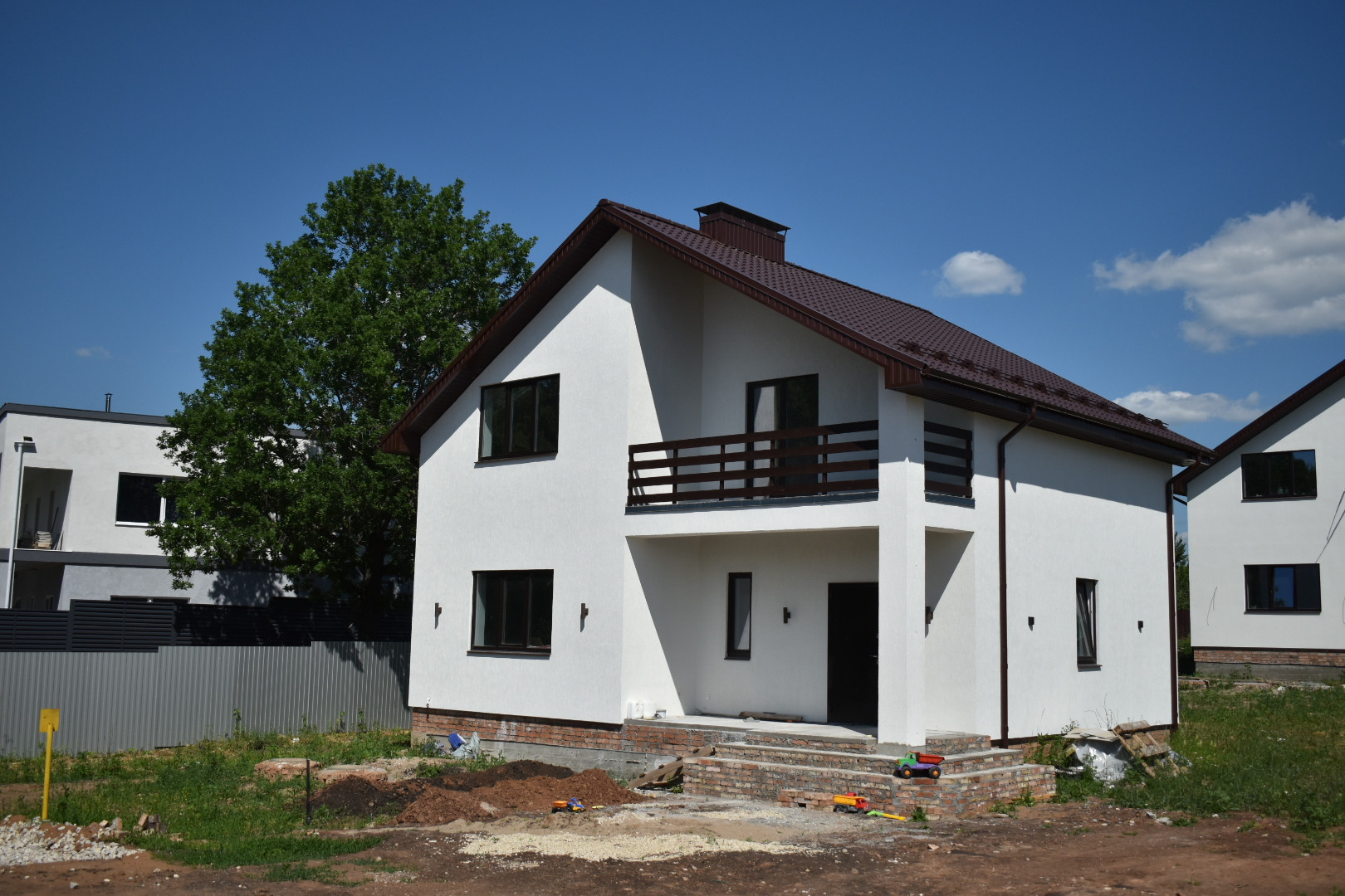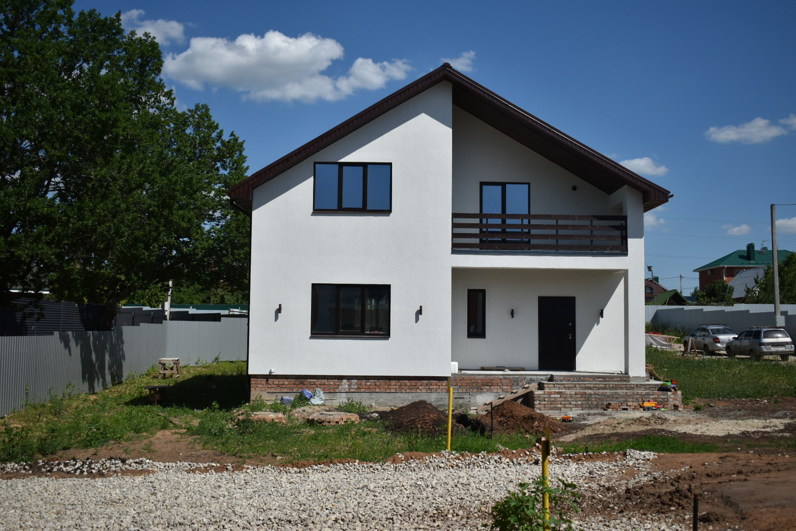 2-этажный коттедж расположен на участке площадью от 7 соток. Все коммуникации (электричество, газ, центральное водоснабжение, автономная канализация) доведены до участка.