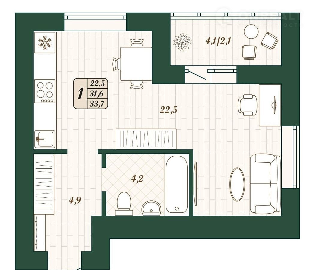 Общая площадь 31.6 м2