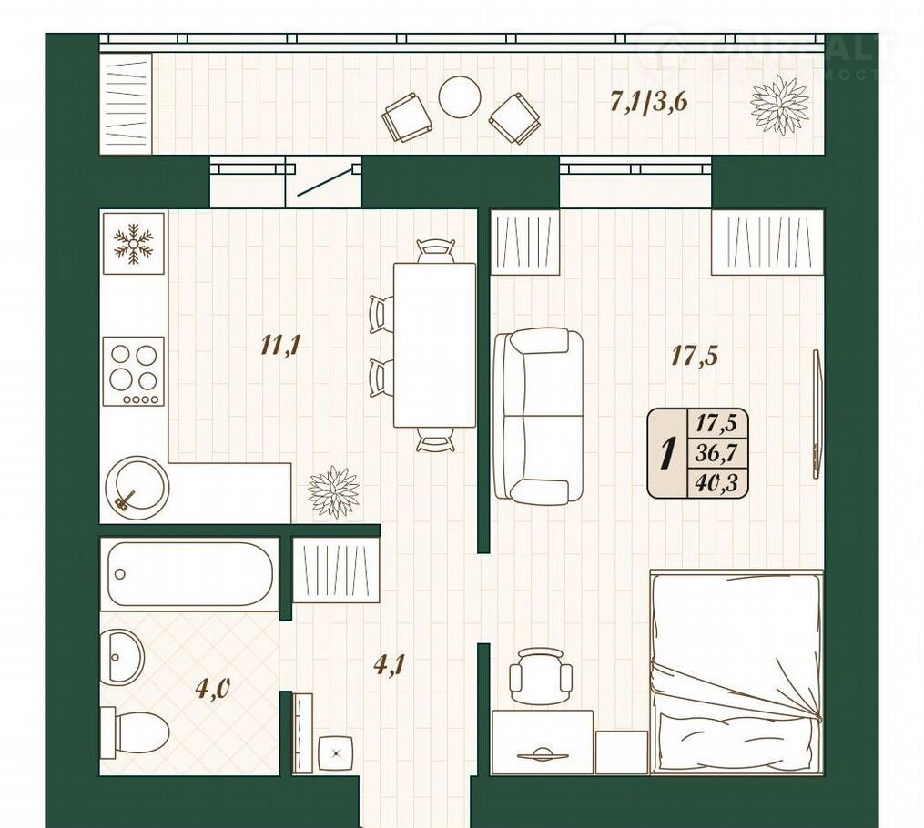 Общая площадь 36.7 м2