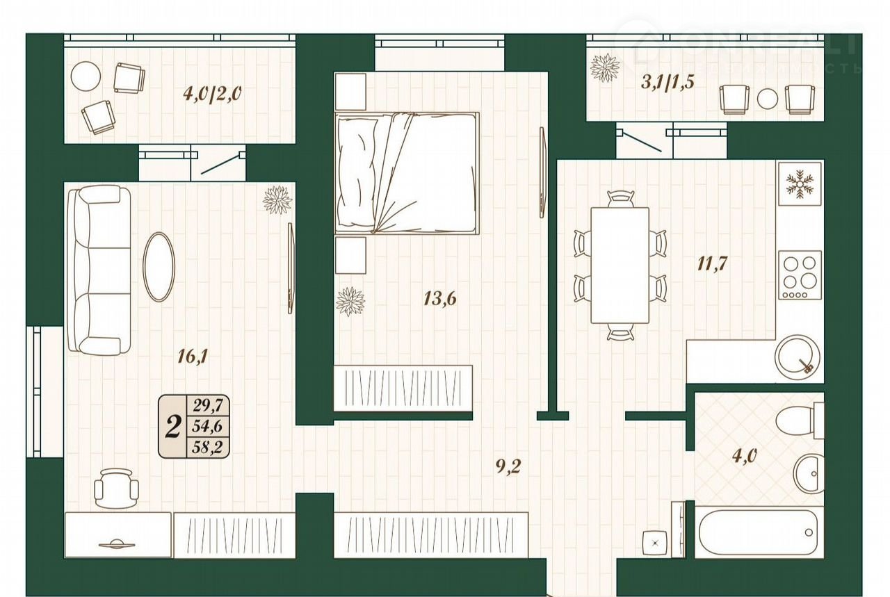 Общая площадь 54.6 м2