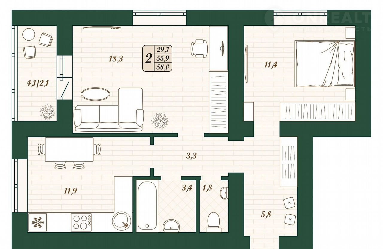 Общая площадь 55.9 м2