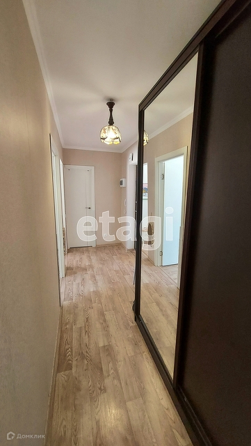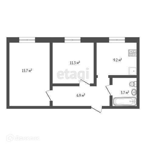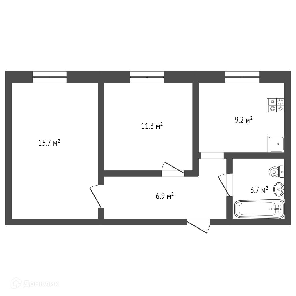Общая площадь квартиры 46.8 кв.м, кухня 9.2 кв.м, комнаты: 15.7 и 11.3 кв.м, большой коридор 6.9 кв.м. Санузел совмещенный. В квартире выполнен косметический ремонт. Частично остаётся мебель и техника.