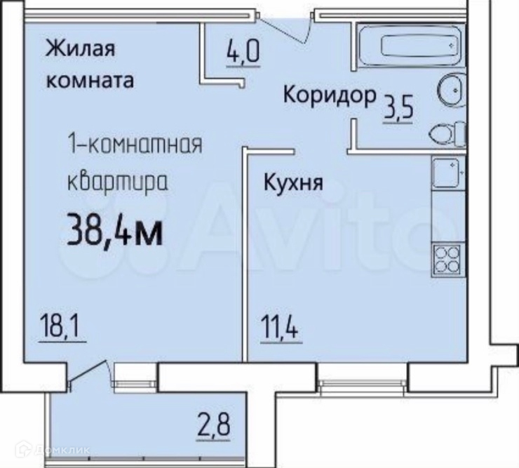 Общая площадь 38.4 м2