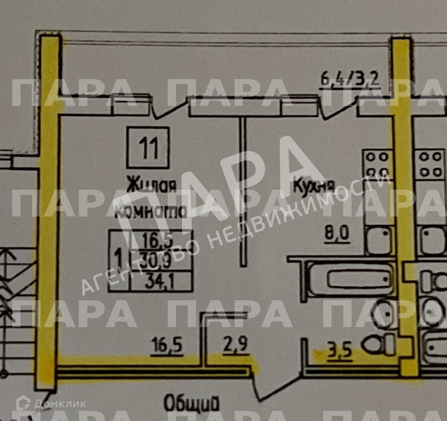 Общая площадь 34.1 м2