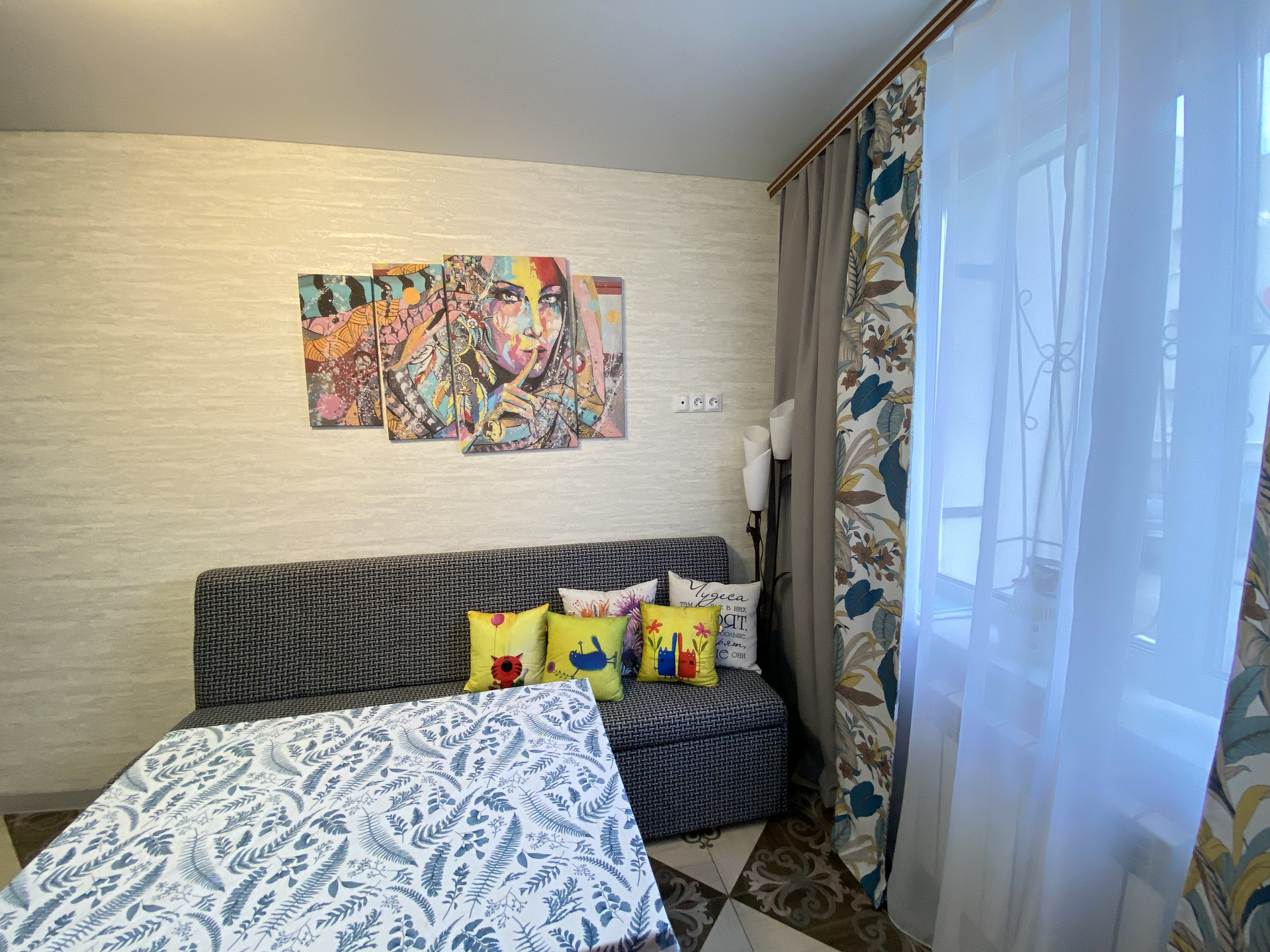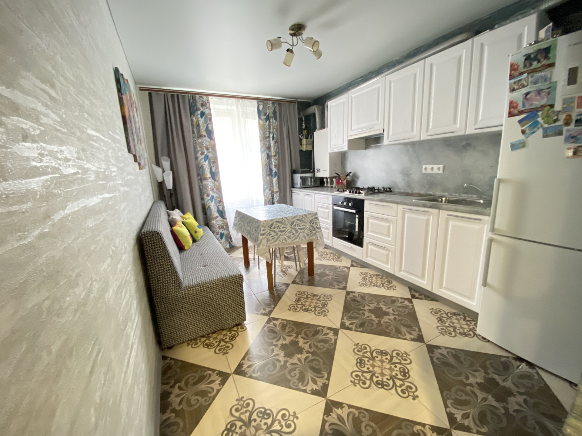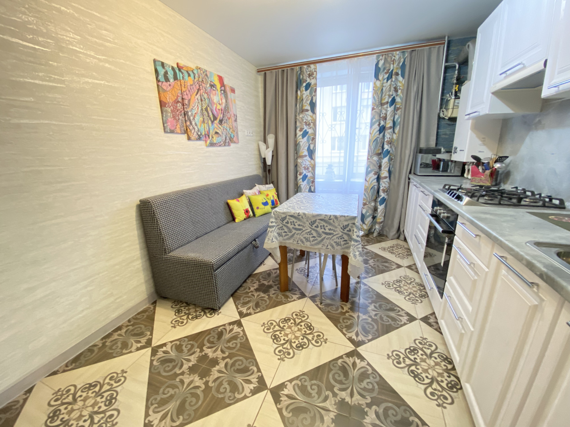Кухня 12кв.м,натяжные потолки,на полу плитка.Теплый пол