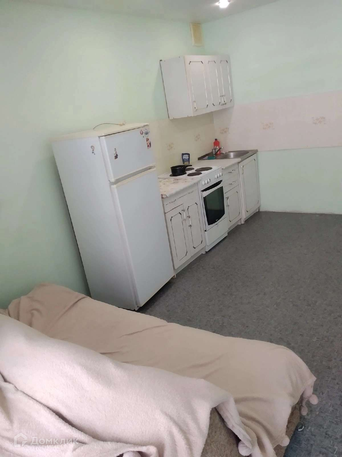 В квартире есть все, что нужно для проживания - холодильник, стиральная машинка, кровать, диван, шкаф, кухонный гарнитур, телевизор.