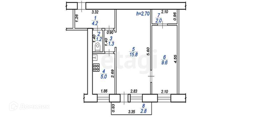 ✔️ Комнаты 15,8 кв. м. и 9,6 кв. м., кухня 5 кв. м., балкон 2,8 кв м., гардеробная/кладовая 2 кв. м.