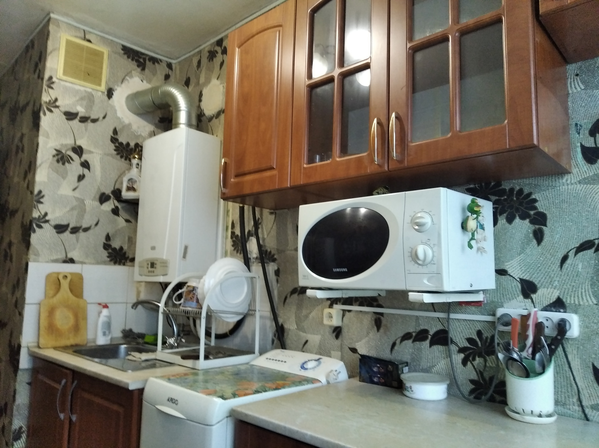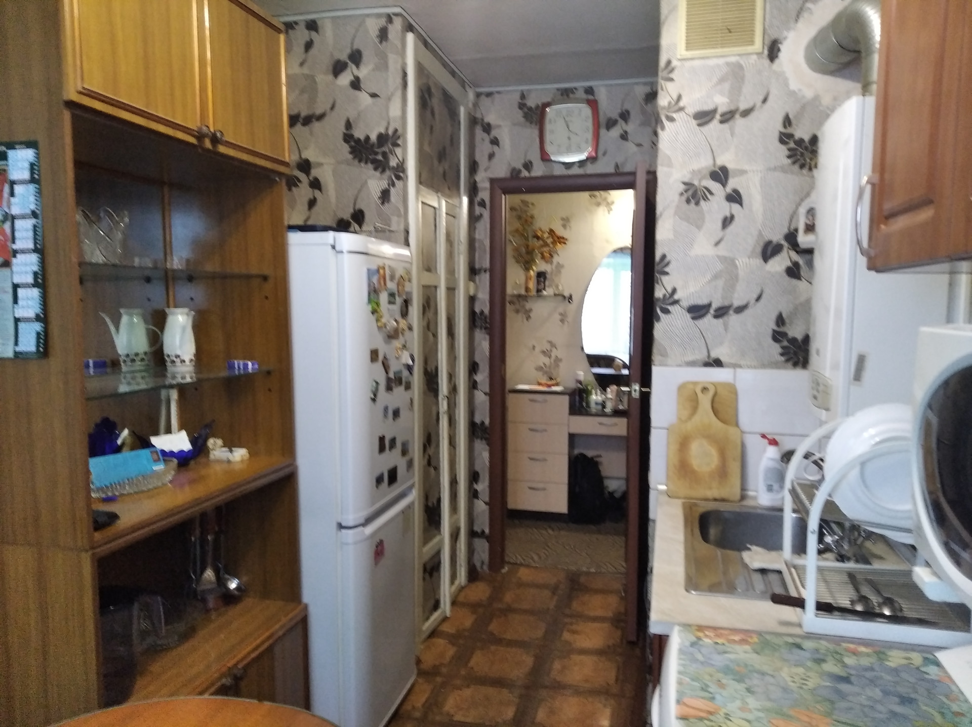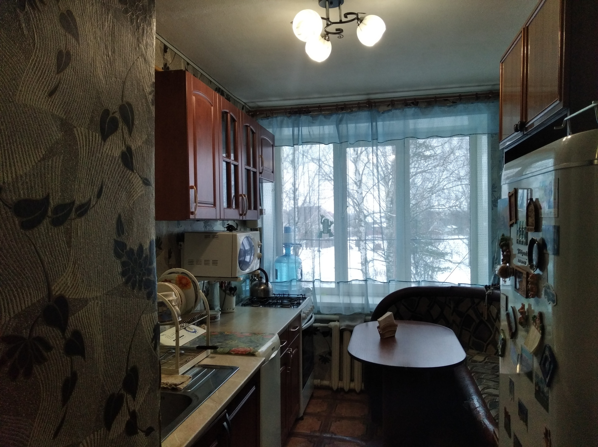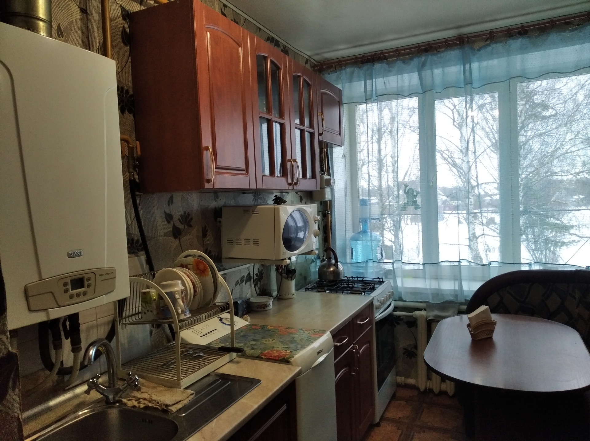 Кухня удобной планировки. Прямоугольной формы, что позволяет функционально расставить мебель. На кухне двухконтурный котел, плита газовая. Пластиковое окно, пол линолеум.