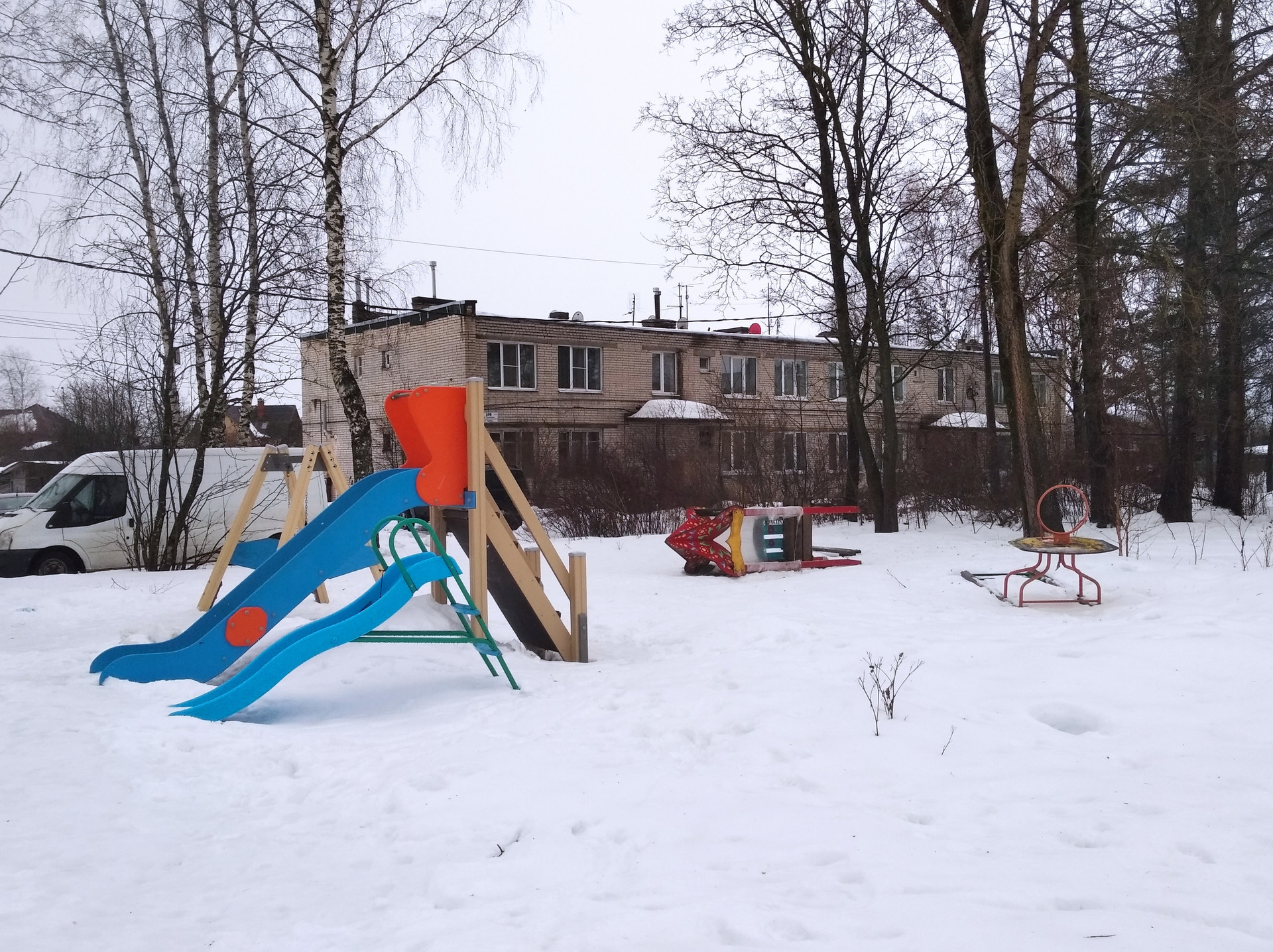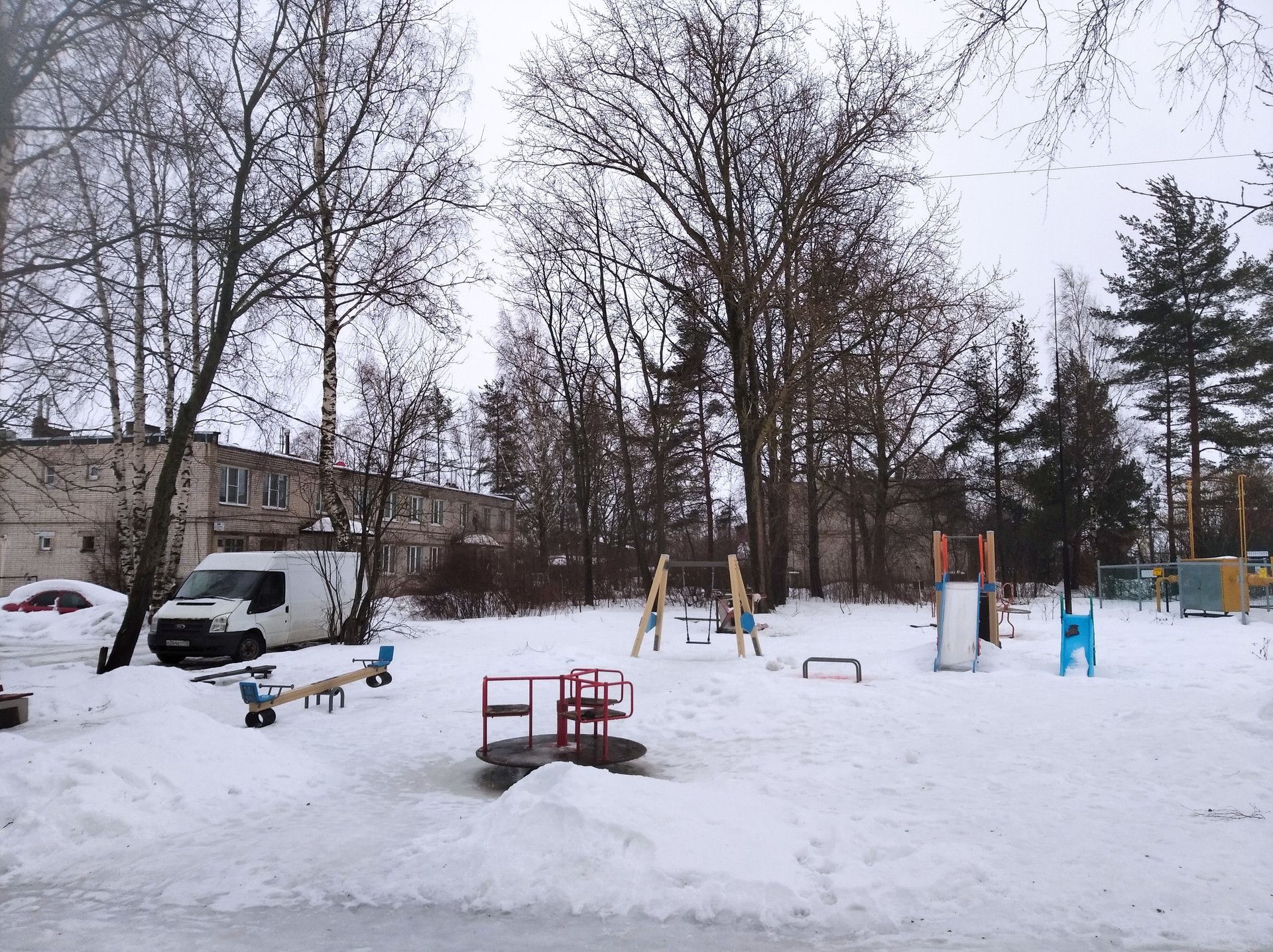 Во дворе детская площадка. Рядом магазин, парикмахерская, баня.