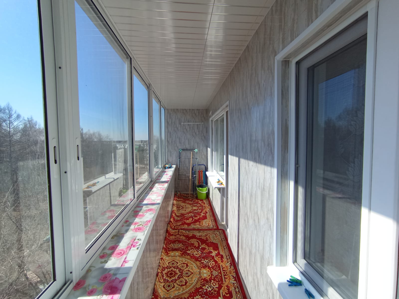 · Большая лоджия утеплена и обшита пластиковыми панелями, остеклена