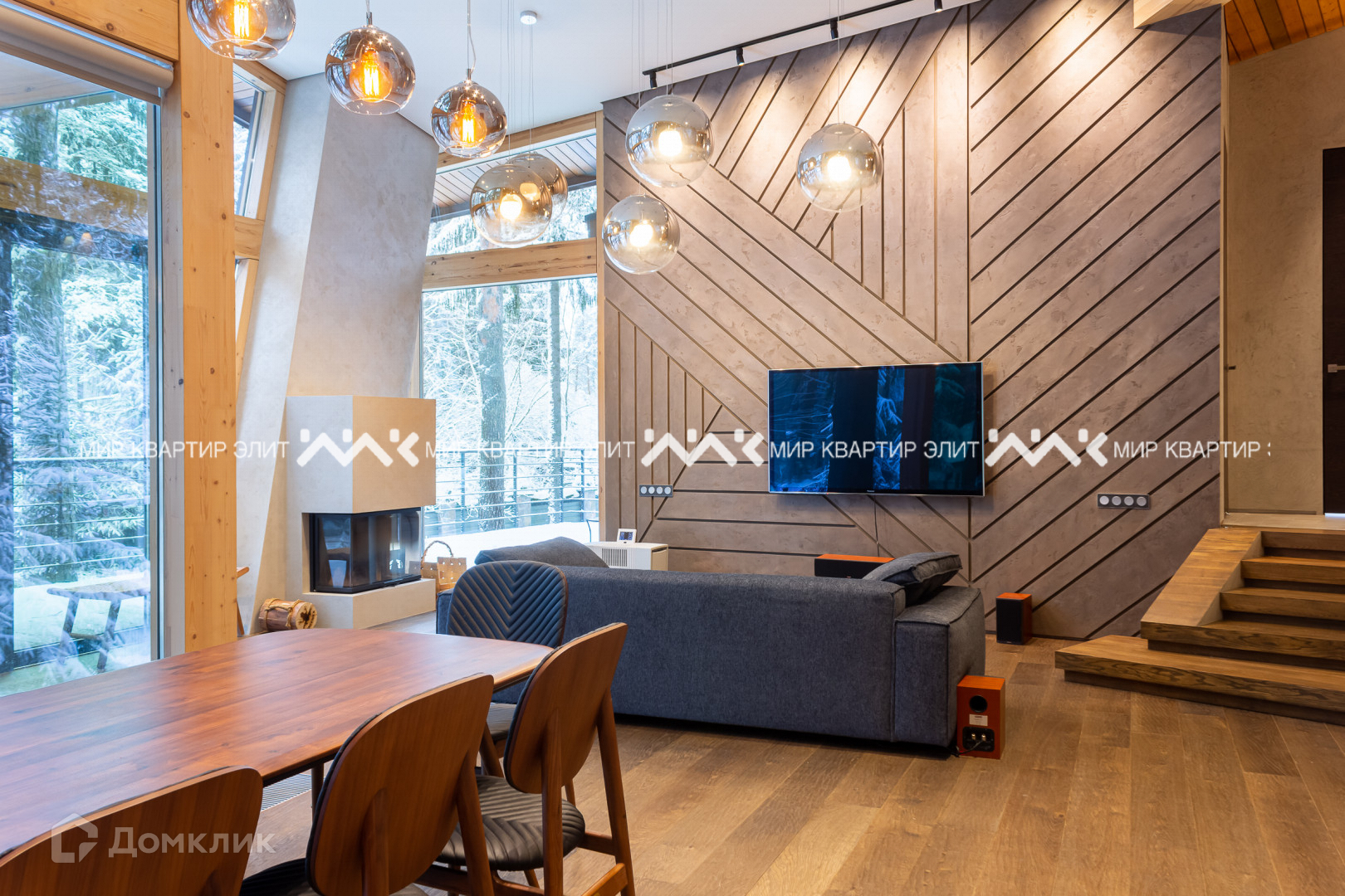 — кухня-гостиная, куда входят столовая, зона отдыха с камином и зона с телевизором;