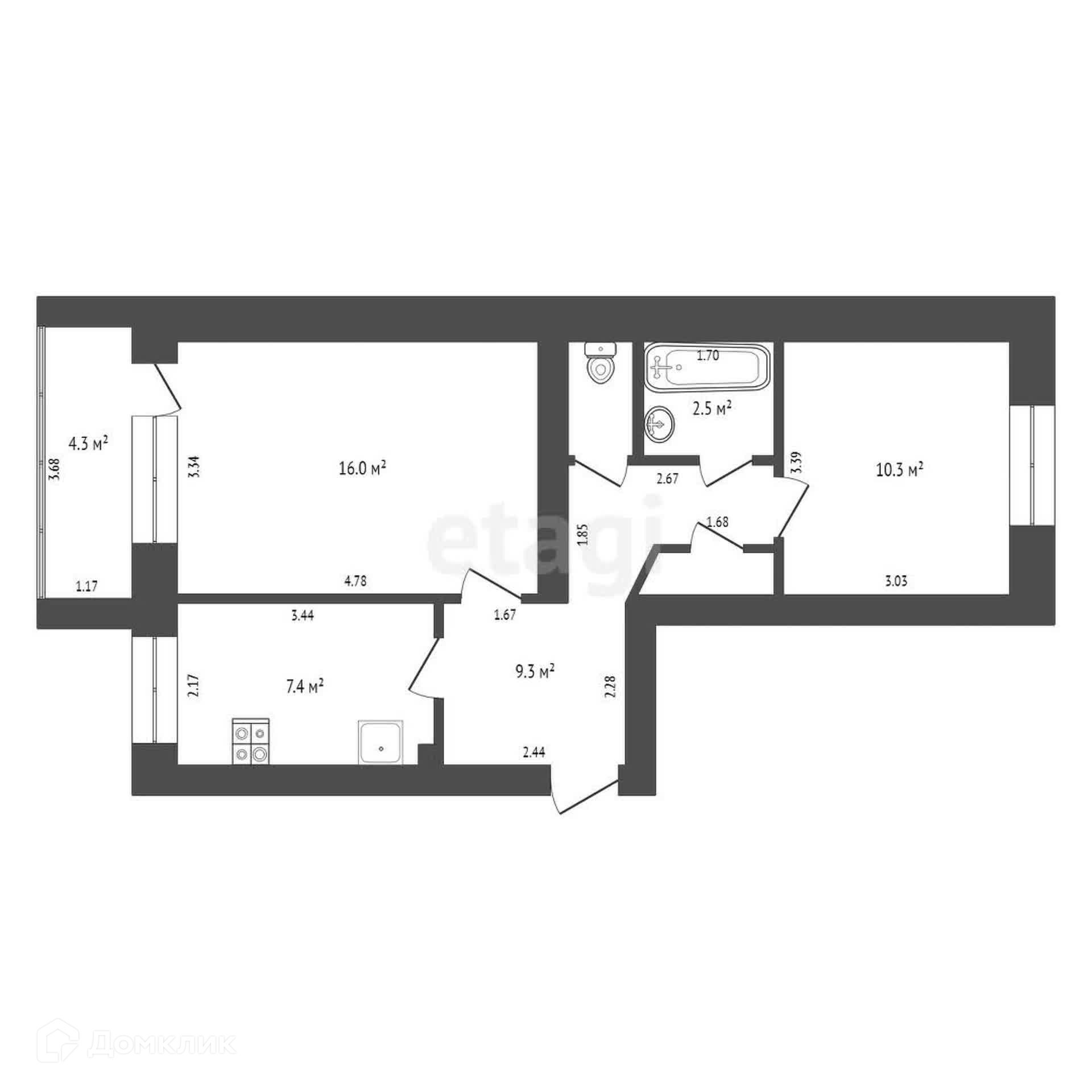 Общая площадь квартиры составляет 47,5 м2; жилая 26,3 м2, кухня 7,4 м2,