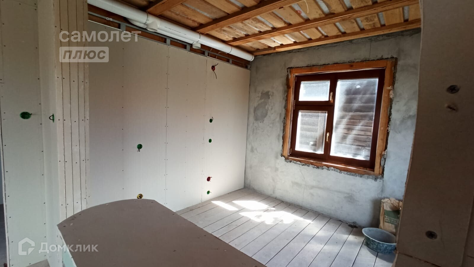 - Стены дома выполнены из бруса 200х200 мм, капитальные перегородки в коридоре - 100х200 мм, межкомнатные - из гипсокартона и металлопрофиля.
