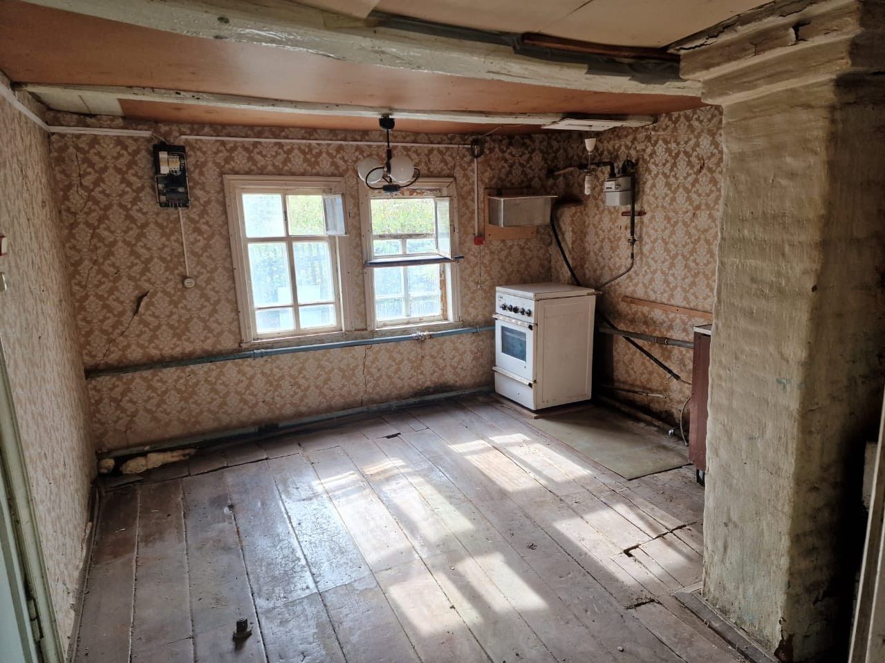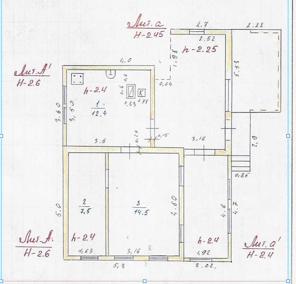 • Общая площадь – 60 кв.м. (из них отапливаемой - 34,4 кв.м.), жилая – 22 (14,5+7,5) кв.м., можно увеличить на 25 кв.м., кухня – 12,4 кв.м., терасса – 12 кв.м., высота потолка – 2,4 м.