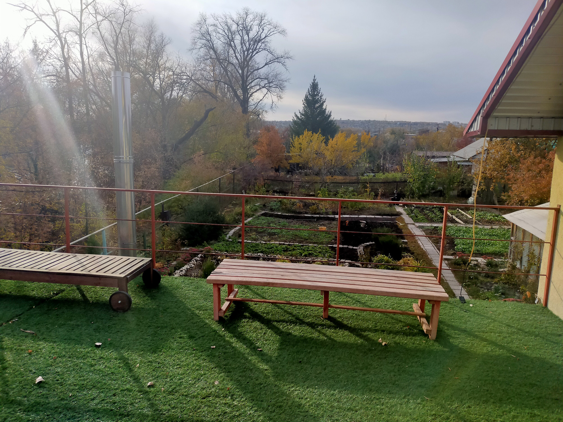 Участок с плодоносящими насаждениями: черешня, вишня, груша, 4 яблони разных сортов, слива, калина, рябина, черемуха, малина, клубника, виноград, чёрная и красная смородина, крыжовник.