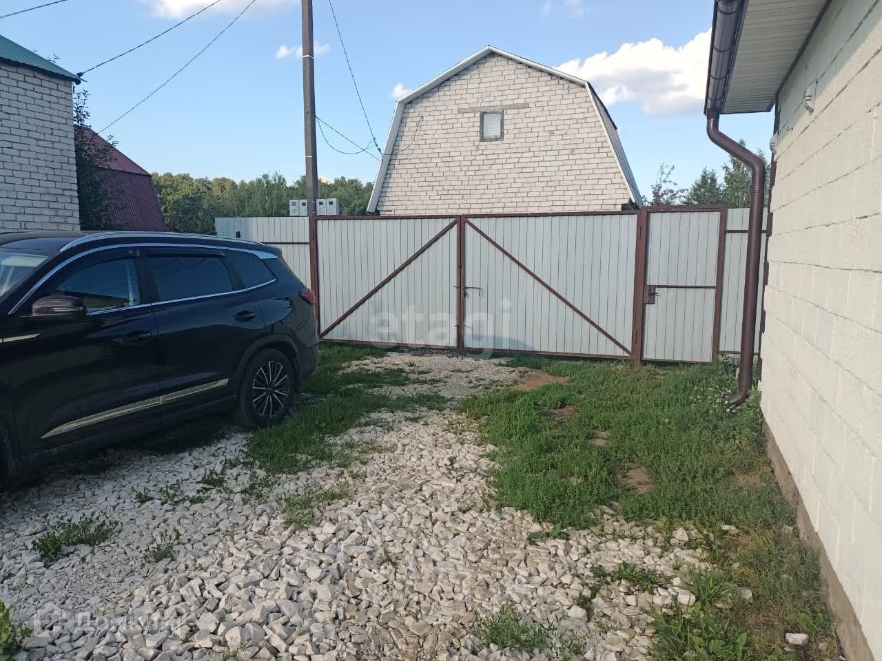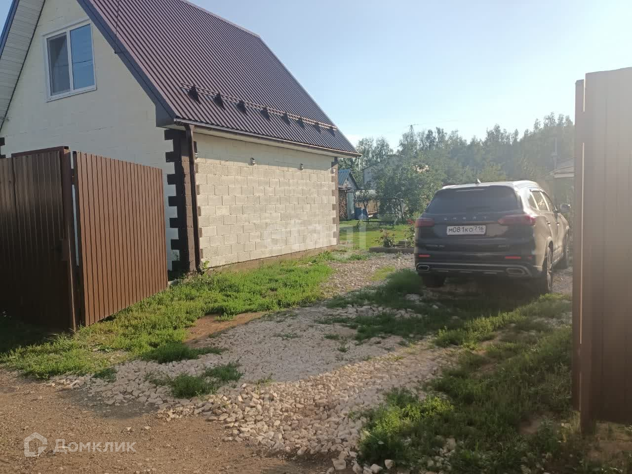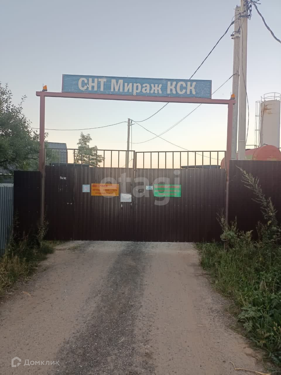 Заезд в СНТ с дороги, ворота автоматические. На участок заезжает 2 машины.
