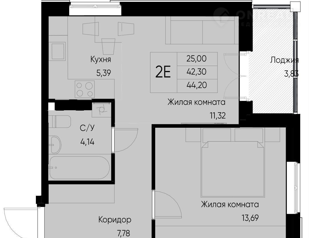 Общая площадь 44.2 м2