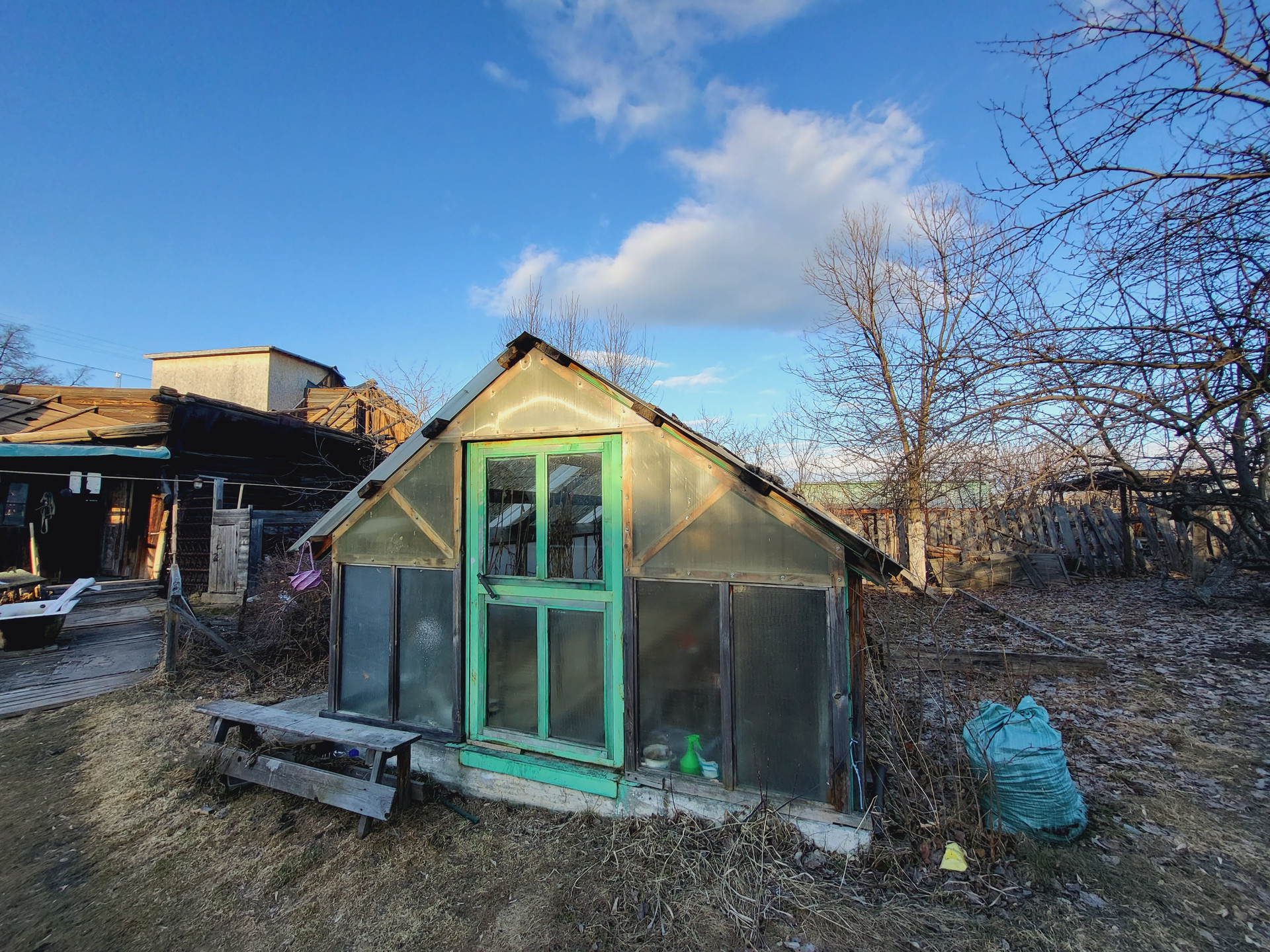 В этой части участка находится еще один дом старой постройки с 3-мя комнатами и газовым отоплением, теплицы, гараж плодовые деревья и кустарники.