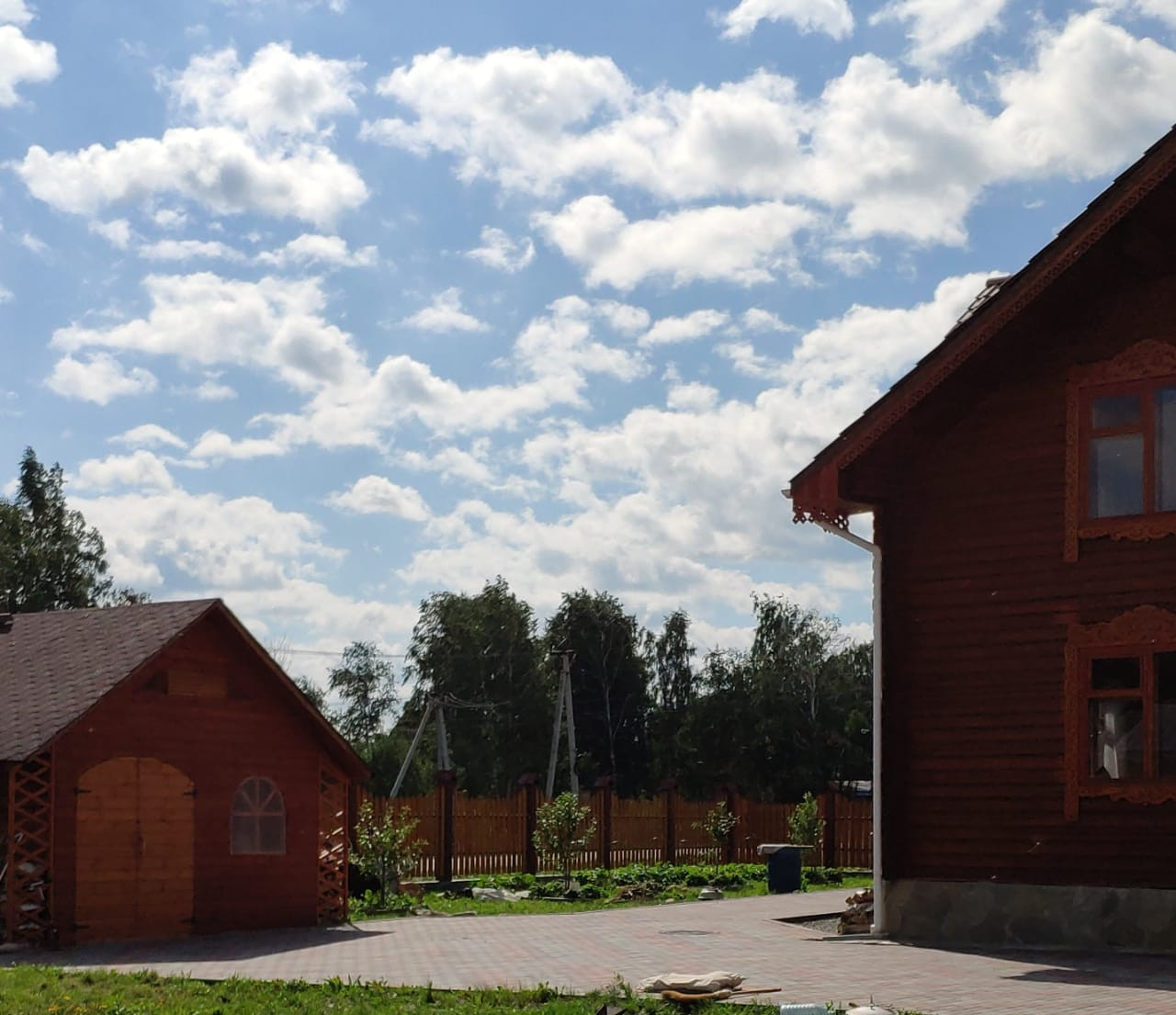 вокруг дома выложены плиткой широкие дорожки , большая территория засеяна газоном где летом стоит бассейн, парковка на несколько машин,