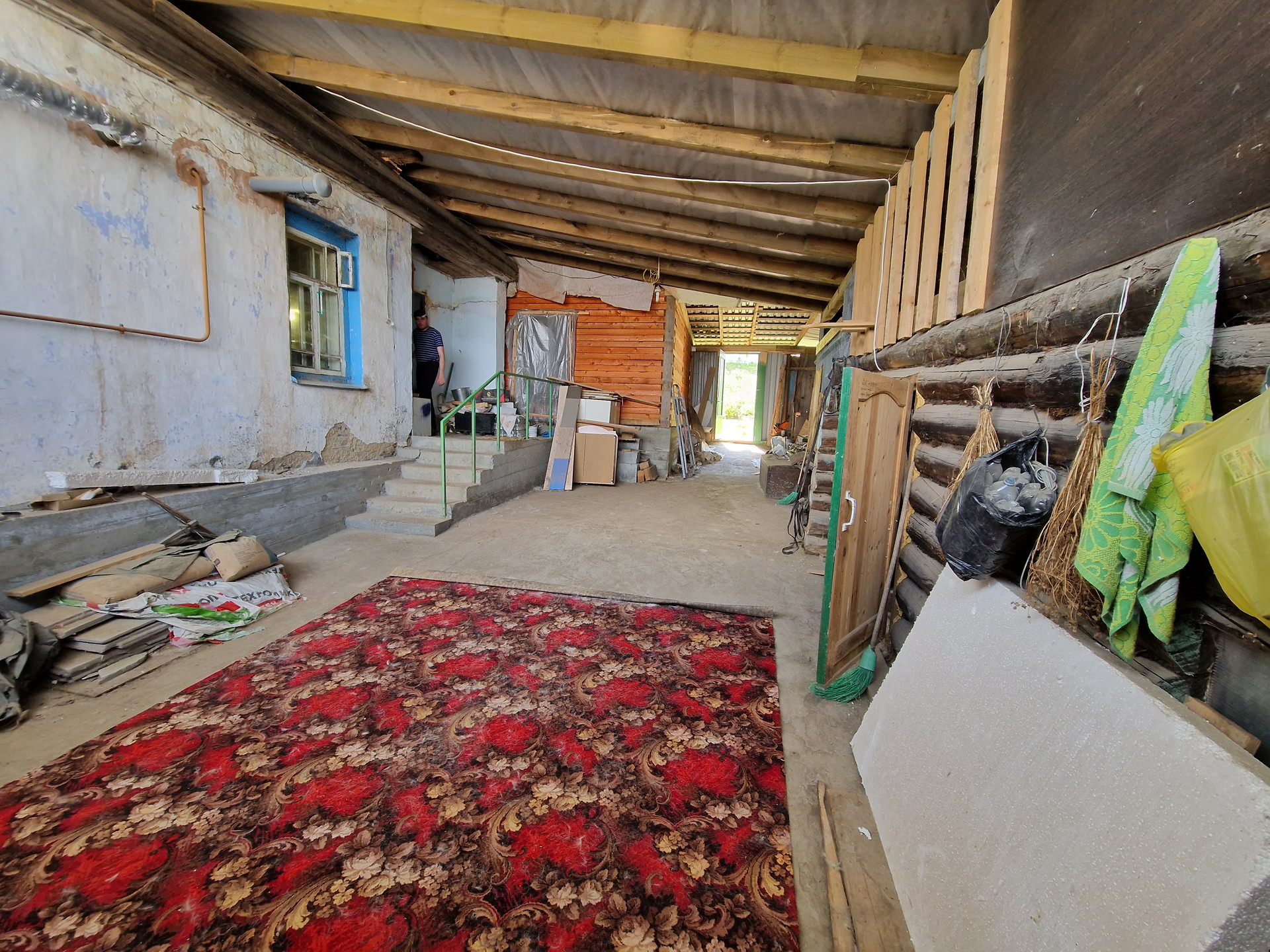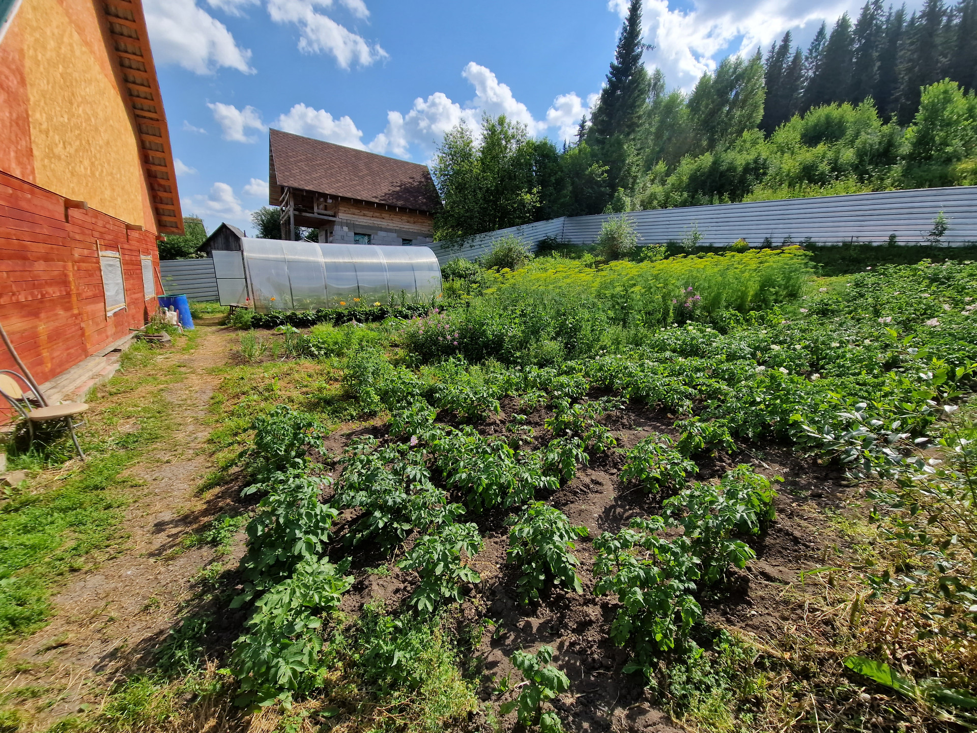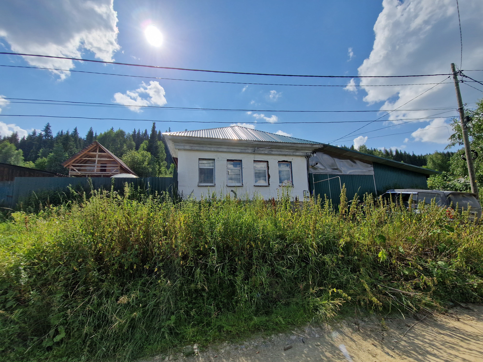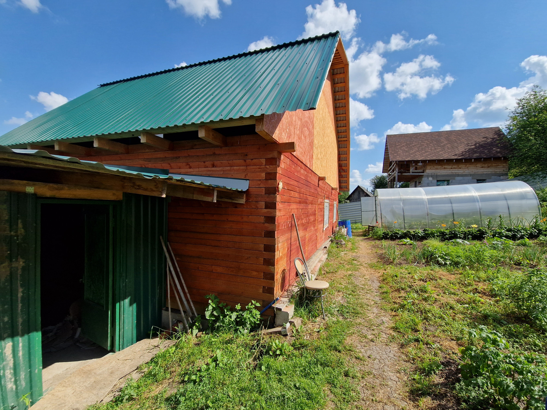 Все коммуникации  (газ, вода, канализация) заведены в дом (основной), есть погреб функционирующий, двор под большим навесом (парковка авто). Под навесом размещены: стайка для домашних животных, мастерская, вольер для собаки. Имеется 2 теплицы из поликарбоната, многолетние насаждения Участок огорожен забором из металлического профиля.