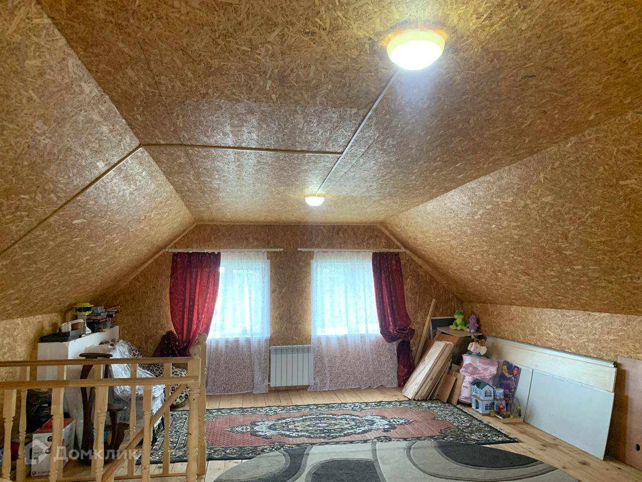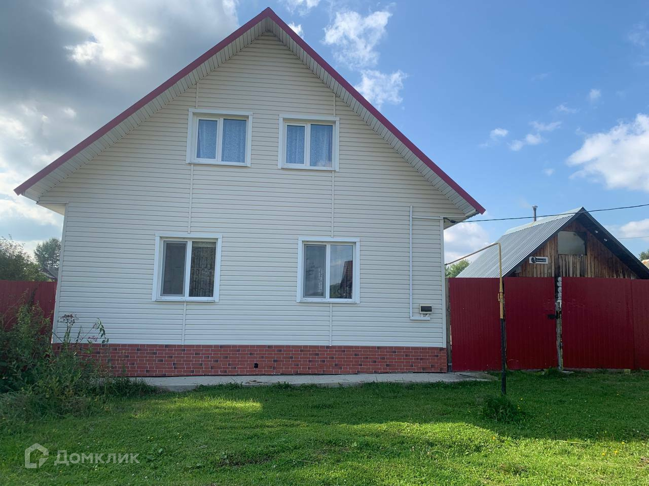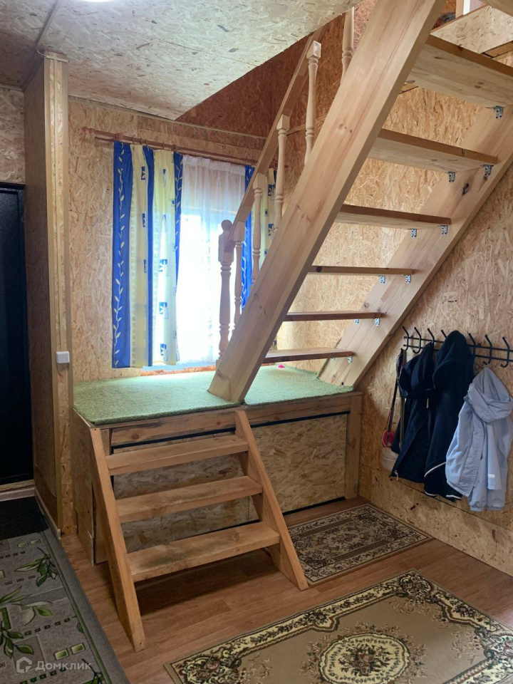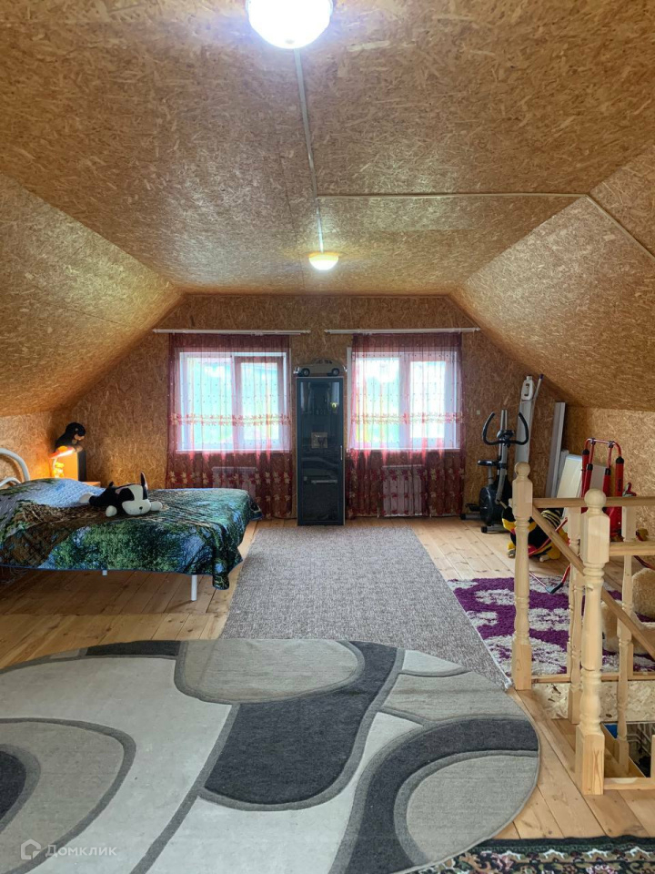 Дом выполнен из 150-го бруса на ленточном фундаменте. Год постройки – 2015 год. Снаружи выполнено утепление и обшит виниловым сайдингом. Крыша покрыта металлочерепицей. Общая площадь дома 103 кв.м. Дом имеет 2 этажа, второй мансардный. На первом этаже располагается просторная прихожая с лестницей на второй этаж, санузел, бойлерная, большая кухня-гостиная и спальня, на втором этаже одна комната.