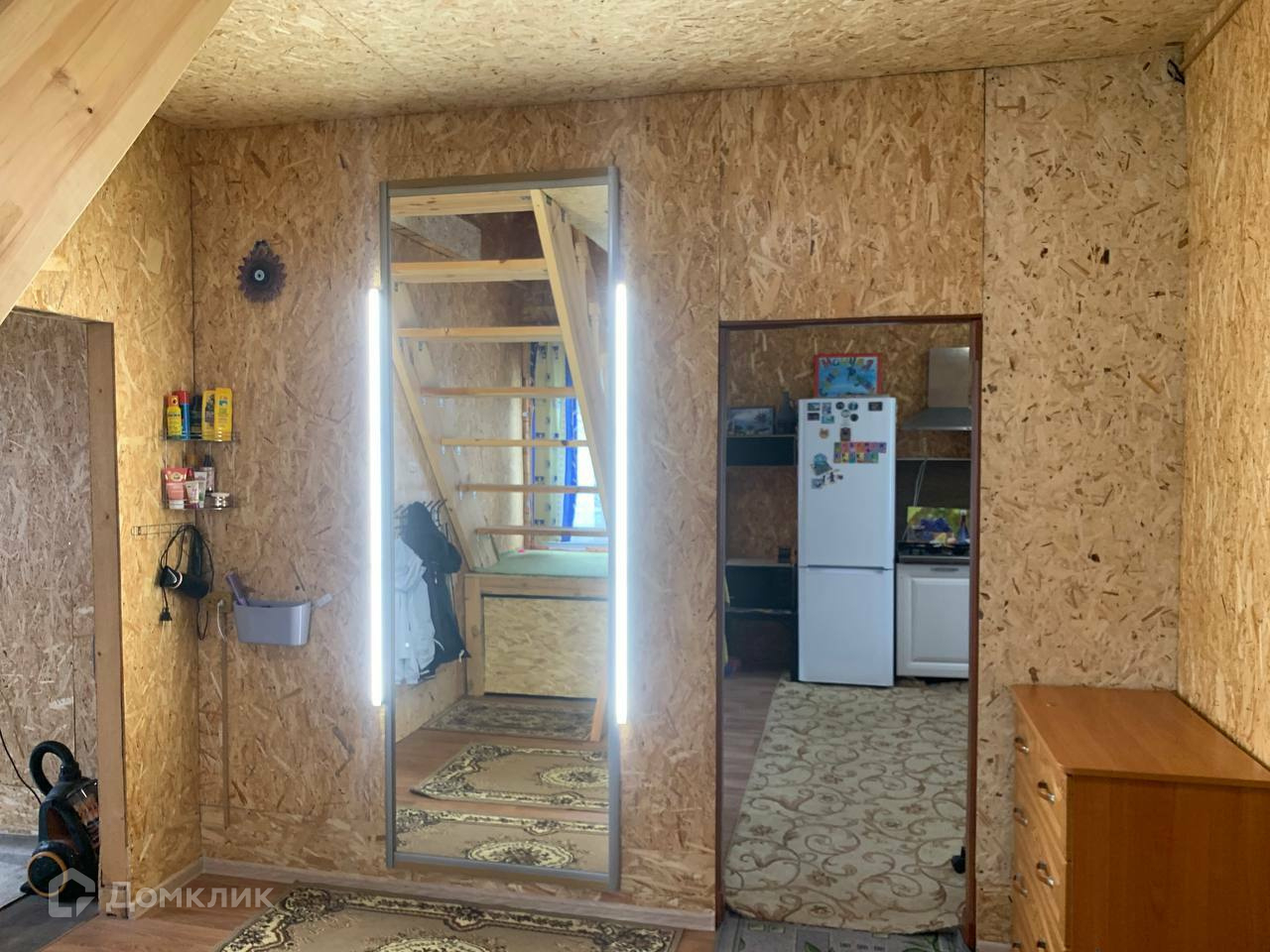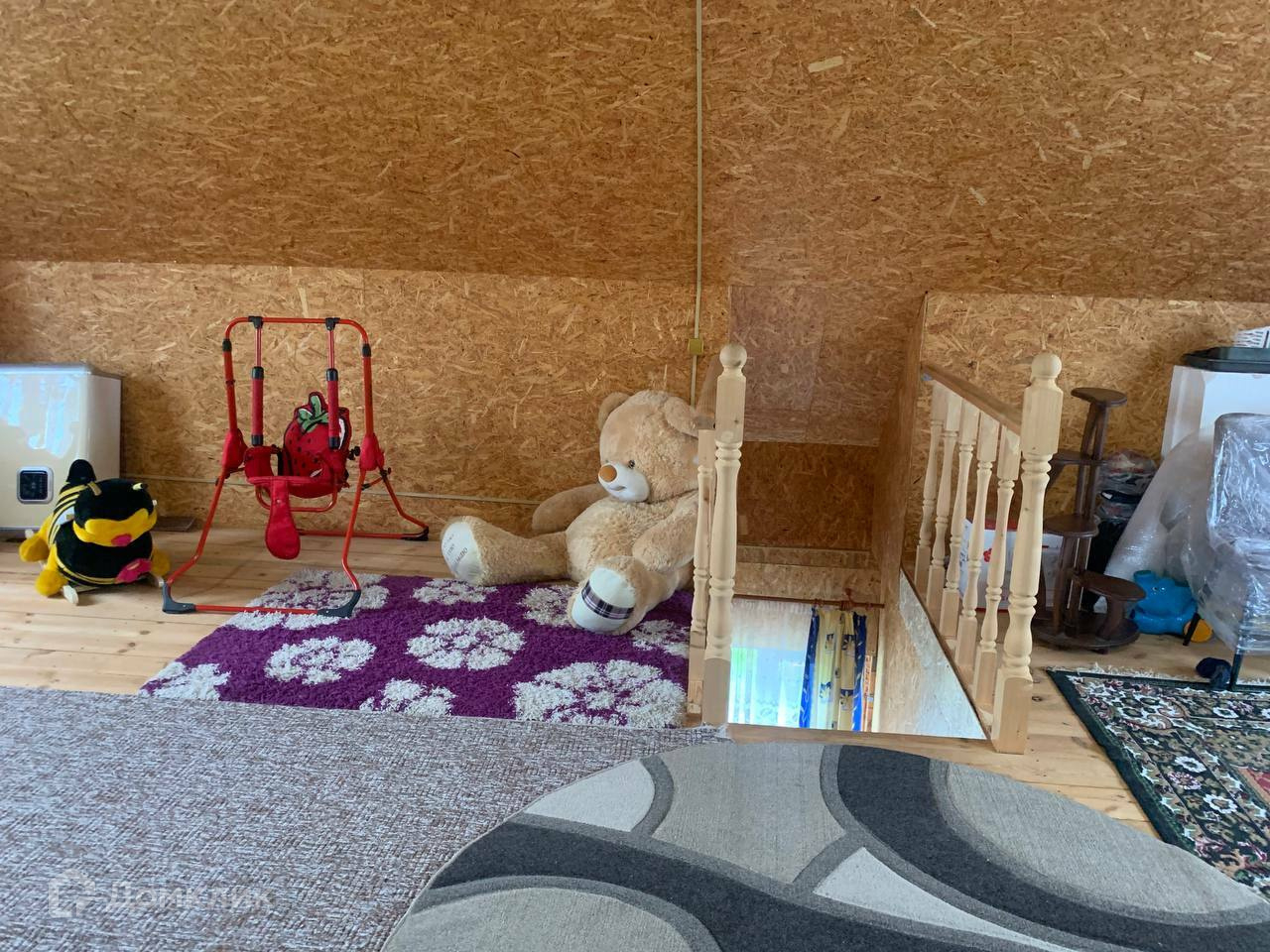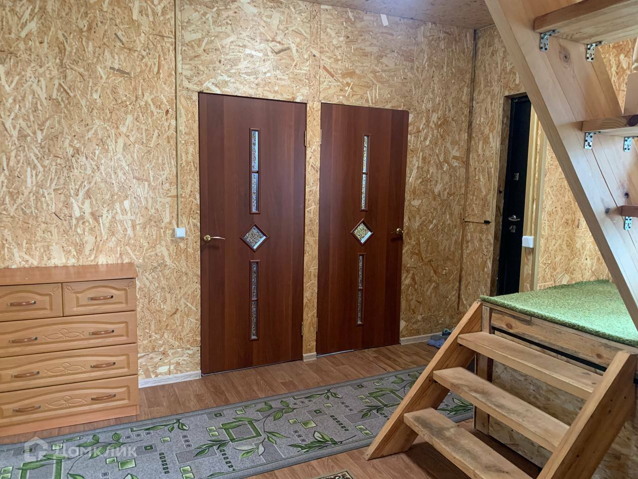 Дом выполнен из 150-го бруса на ленточном фундаменте. Год постройки – 2015 год. Снаружи выполнено утепление и обшит виниловым сайдингом. Крыша покрыта металлочерепицей. Общая площадь дома 103 кв.м. Дом имеет 2 этажа, второй мансардный. На первом этаже располагается просторная прихожая с лестницей на второй этаж, санузел, бойлерная, большая кухня-гостиная и спальня, на втором этаже одна комната.