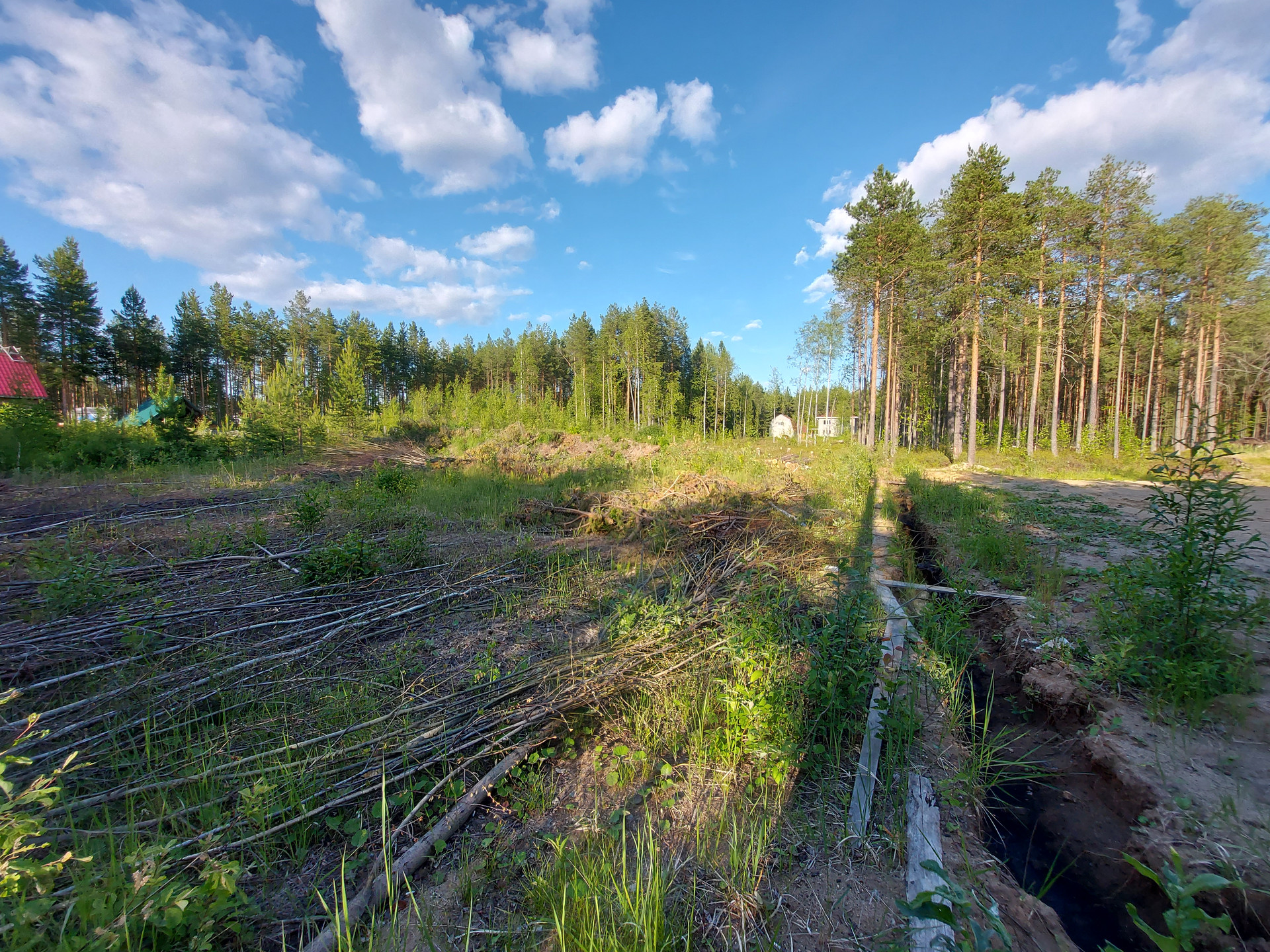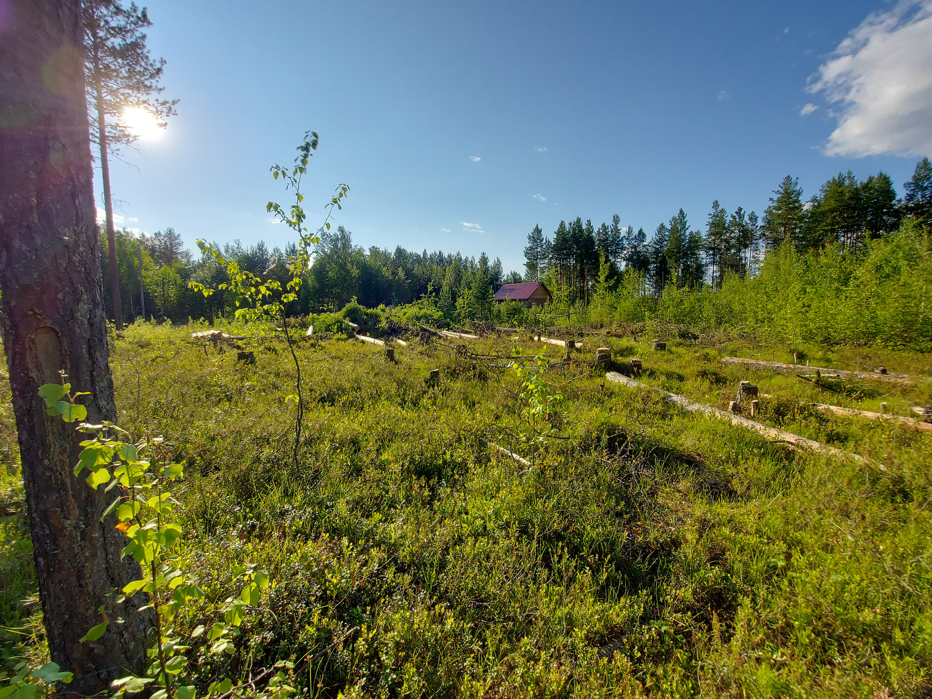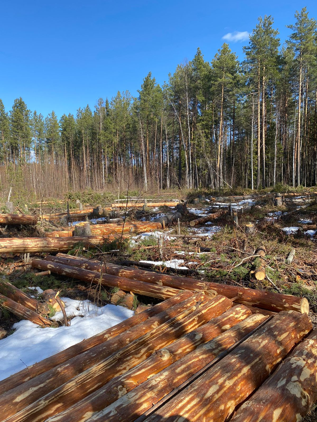 Частично раскорчован, спилены деревья мелкие лежат на участке, деловой лес ошкурен, спилен по 5 метров и сложен также на участке.( смотрите фото)