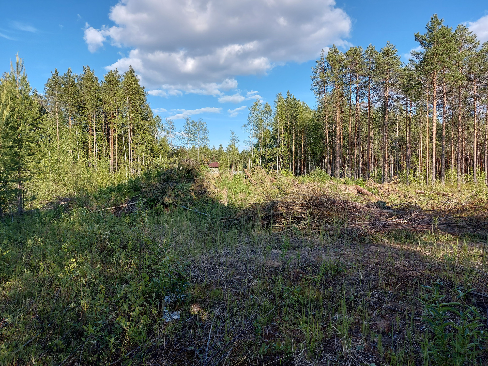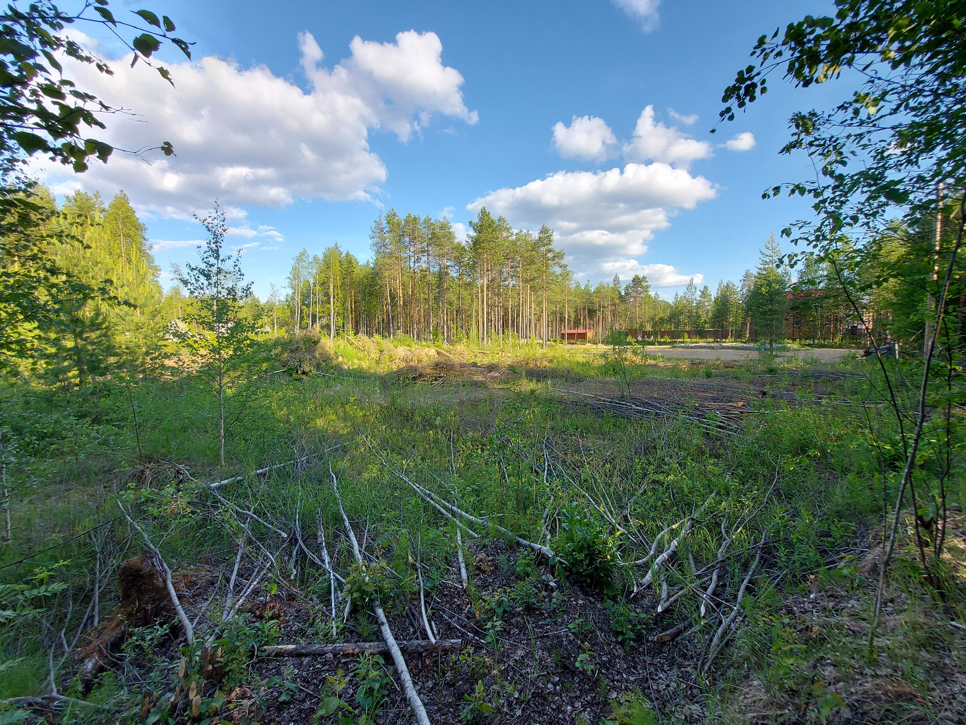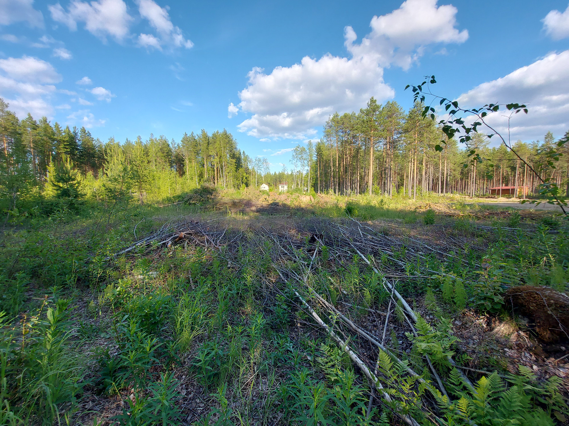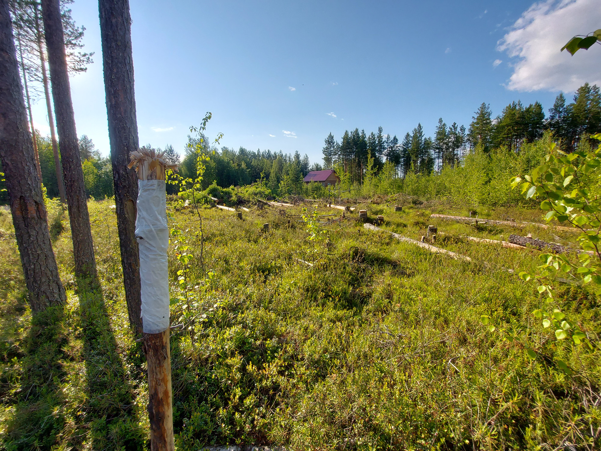 Частично раскорчован, спилены деревья мелкие лежат на участке, деловой лес ошкурен, спилен по 5 метров и сложен также на участке.( смотрите фото)