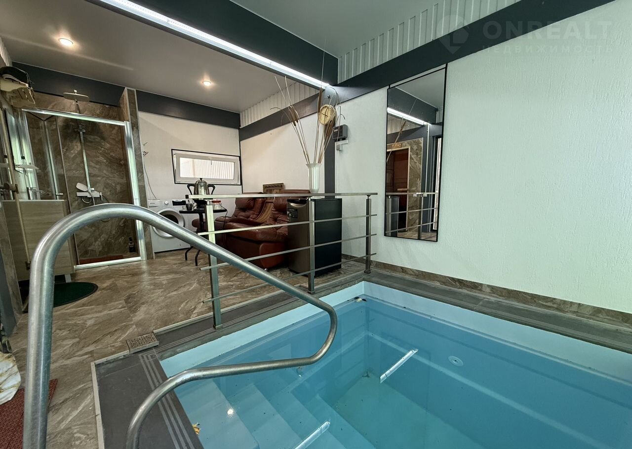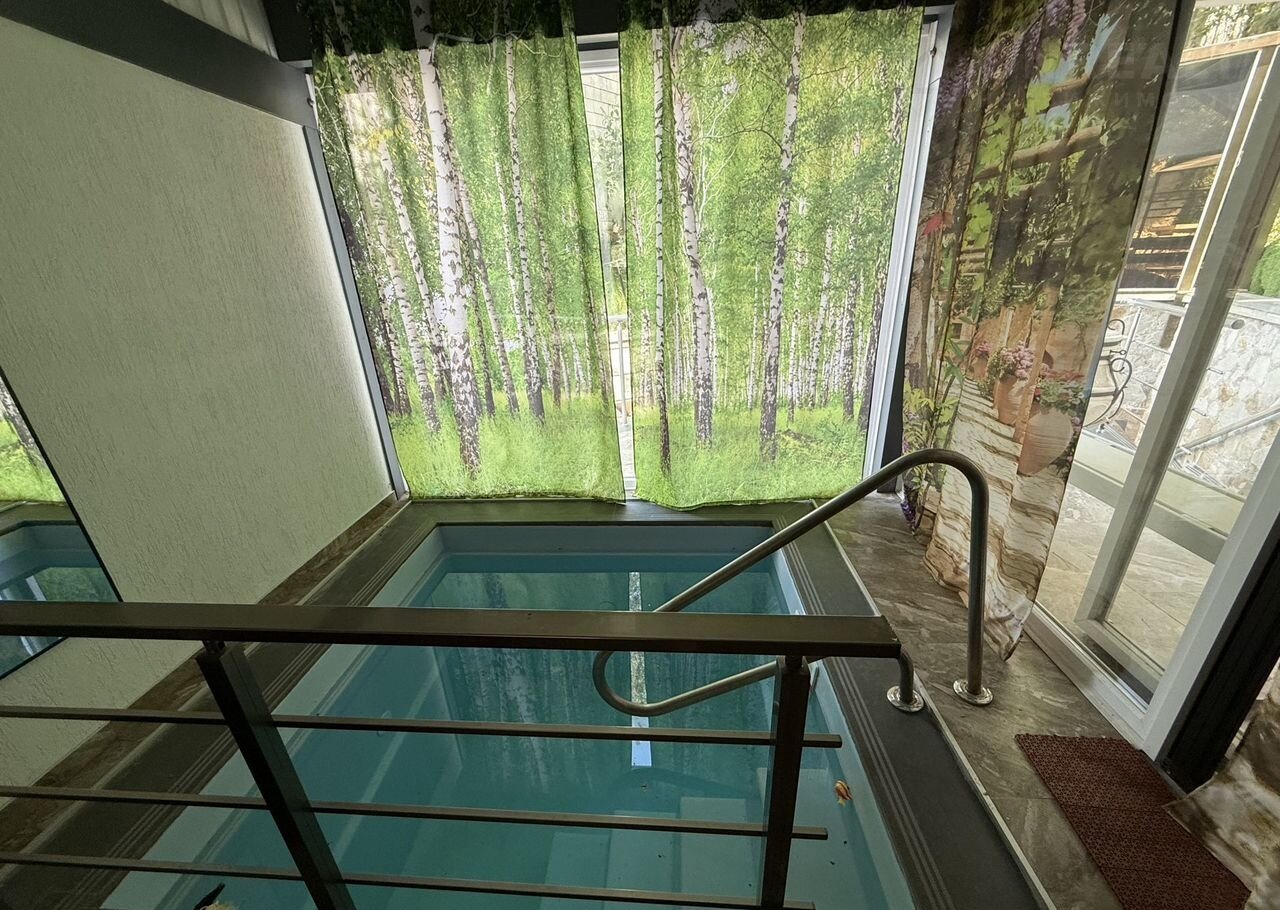 Первый этаж: крытый круглогодичный бассейн, кухню-гостиную с террасой и выходом в собственный лес, две комнаты с выходами на балконы, сан узел.