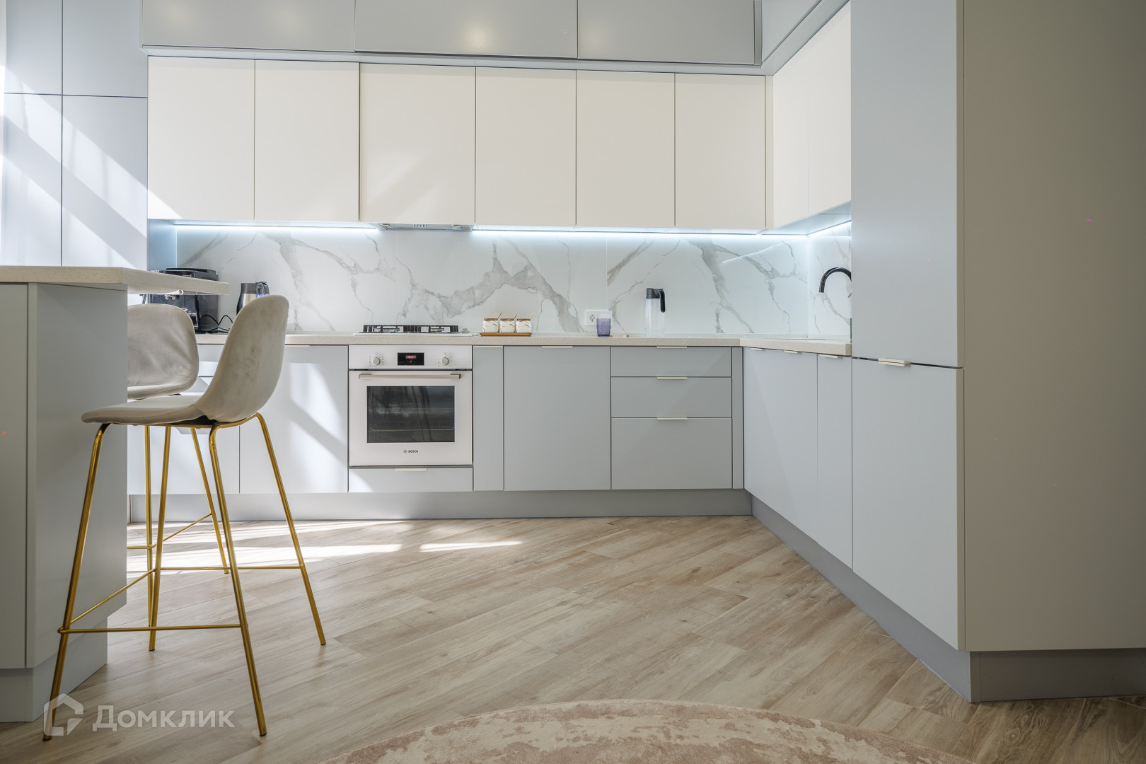 Дизайн и интерьеры выполнены в современном стиле минимализм в светлых тонах. Таунхаус полностью обустроен премиальной мебелью и техникой: бытовая техника - Bosch, сантехника - Hansgrohe.