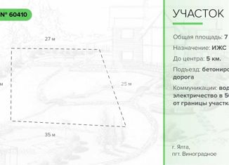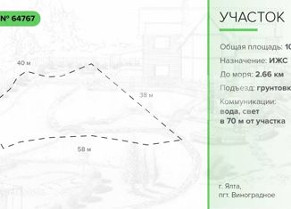 Объект № 64767 Продается земельный участок в поселке городского типа Виноградное (Ялта). Площадь: 10 соток. Назначение земельного участка: индивидуальное жилищное строительство (ИЖС). Участок с незначительным уклоном. Коммуникации: вода, свет в 70 м. от участка. Локация: до магазина 500 м., школа и детский сад 4 км, до центра города 5 км. Количеств... |