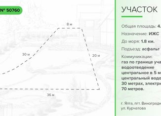 Объект № 50760 Продается земельный участок в городе Ялта, поселок городского типа Виноградное, улица Курчатова. Общая площадь 4,2 соток. Назначение земли: индивидуальное жилищное строительство. Отличное предложение для застройки большого гостевого дома. Локация: располагается межу Севастопольским и Южнобережном шоссе. До ближайшего пляжа от участк... |