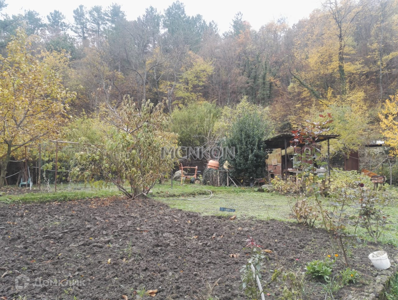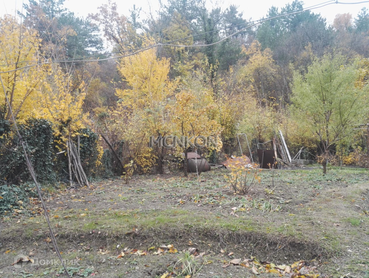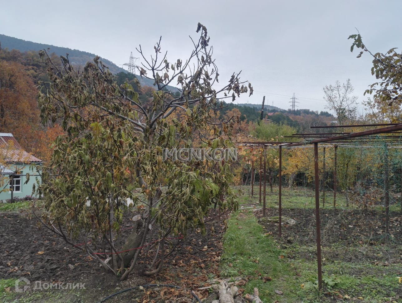 На участке электричество и водопровод, сад с фруктовыми деревьями.