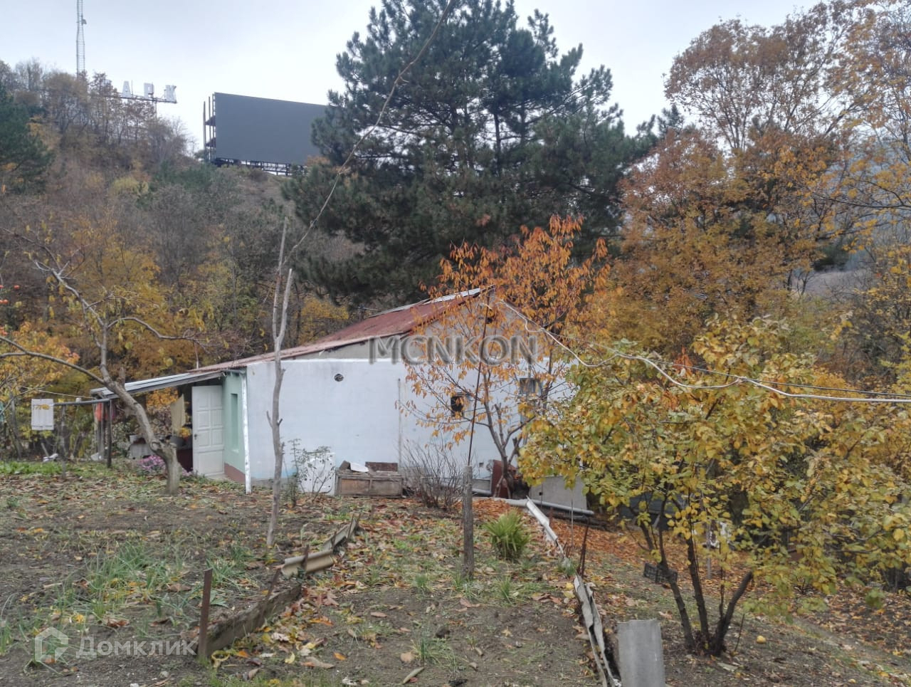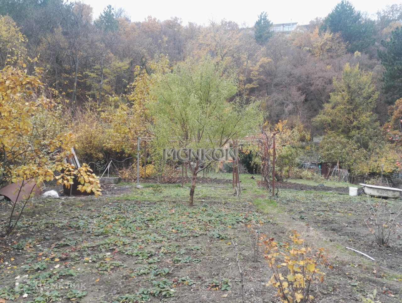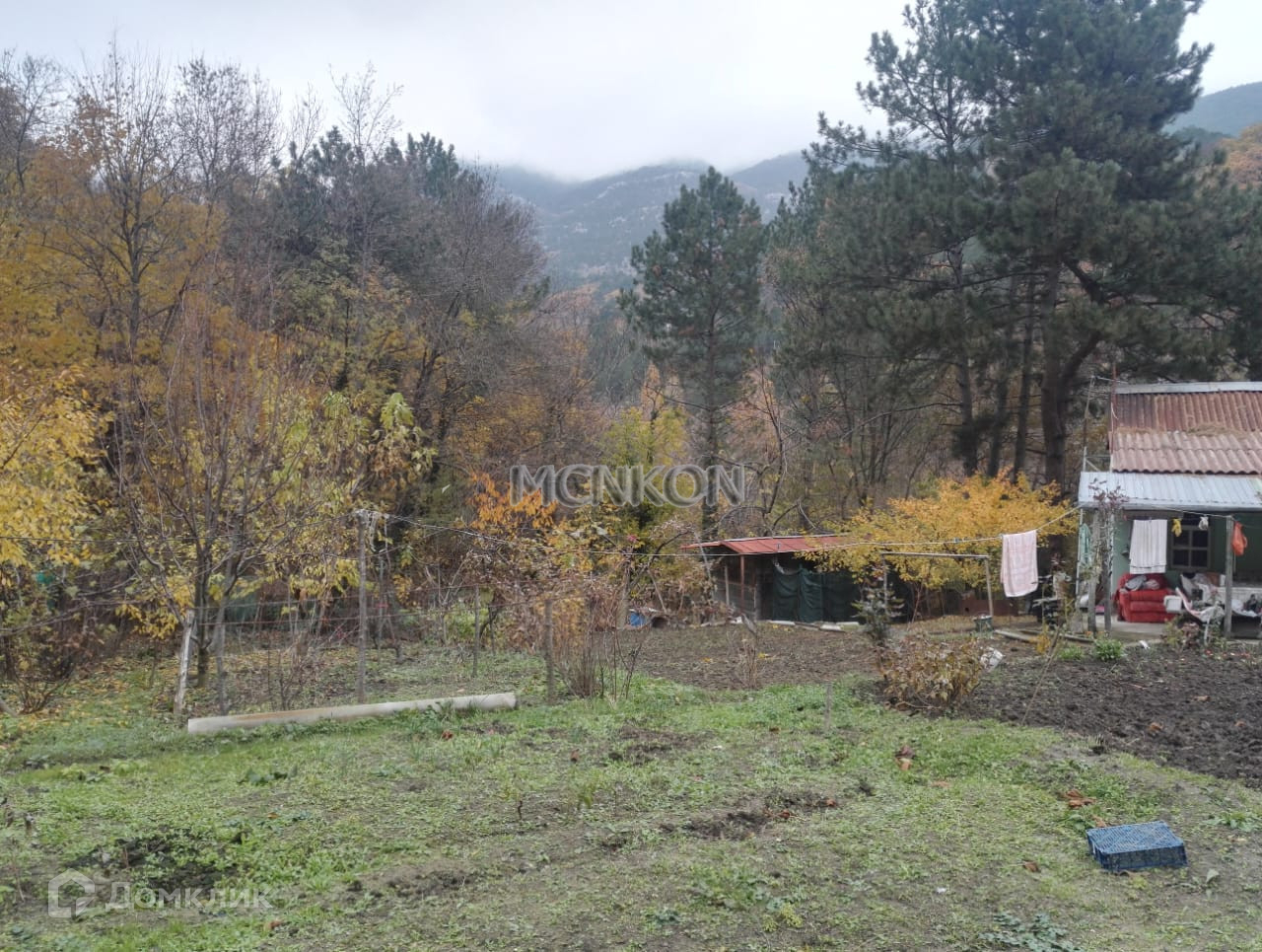На участке электричество и водопровод, сад с фруктовыми деревьями.