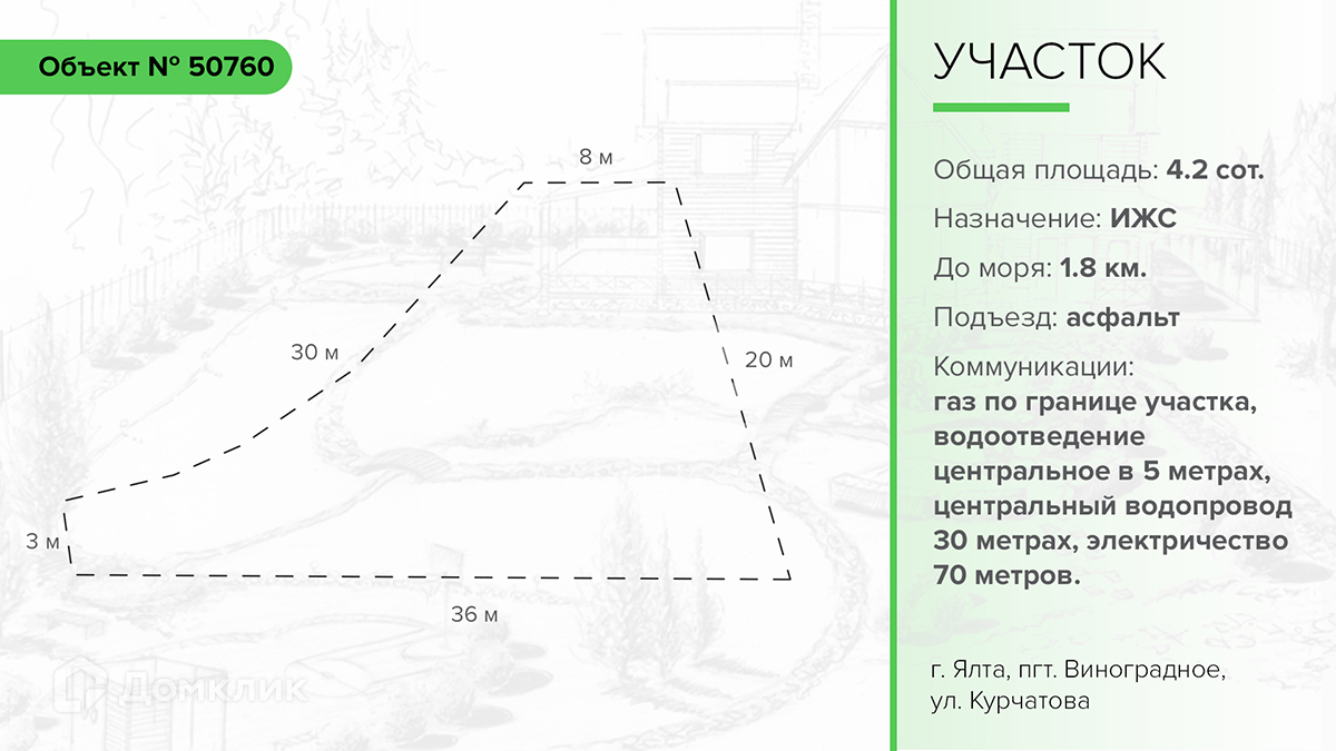 Продается земельный участок в городе Ялта, поселок городского типа Виноградное, улица Курчатова. Общая площадь 4,2 соток. Назначение земли: индивидуальное жилищное строительство.