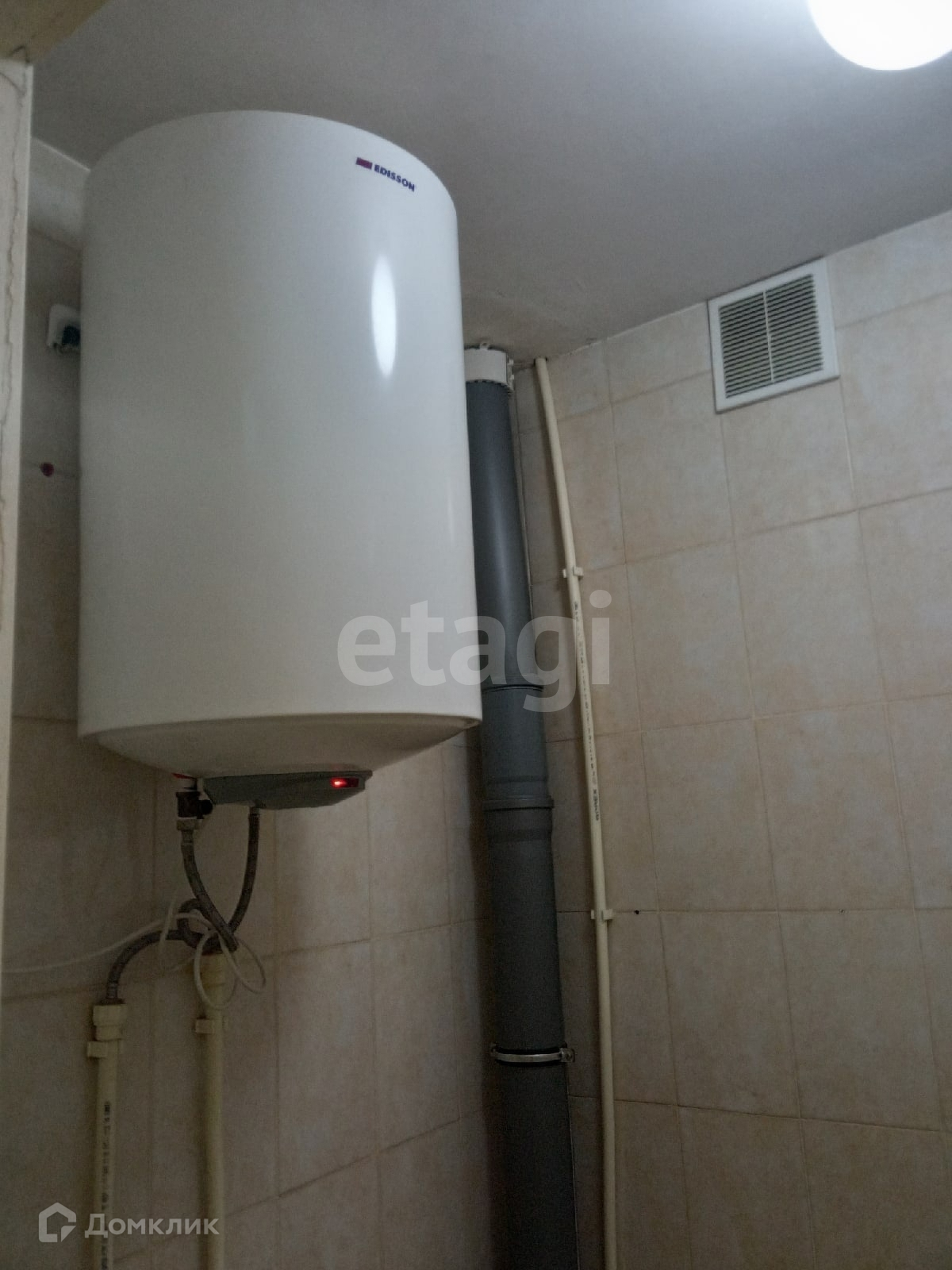 Сан узел совмещен, стены и пол в плитке, так же в сан узле установлен водонагреватель.