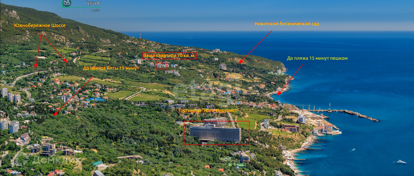 Дом граничит с лесным массивом. Расположен в пгт. Восход. Хорошая логистика: 15 минут до пляжа по зеленой зоне, 700 м до трассы, 1,5 км до Никитского ботанического сада. Близость супермаркета.
